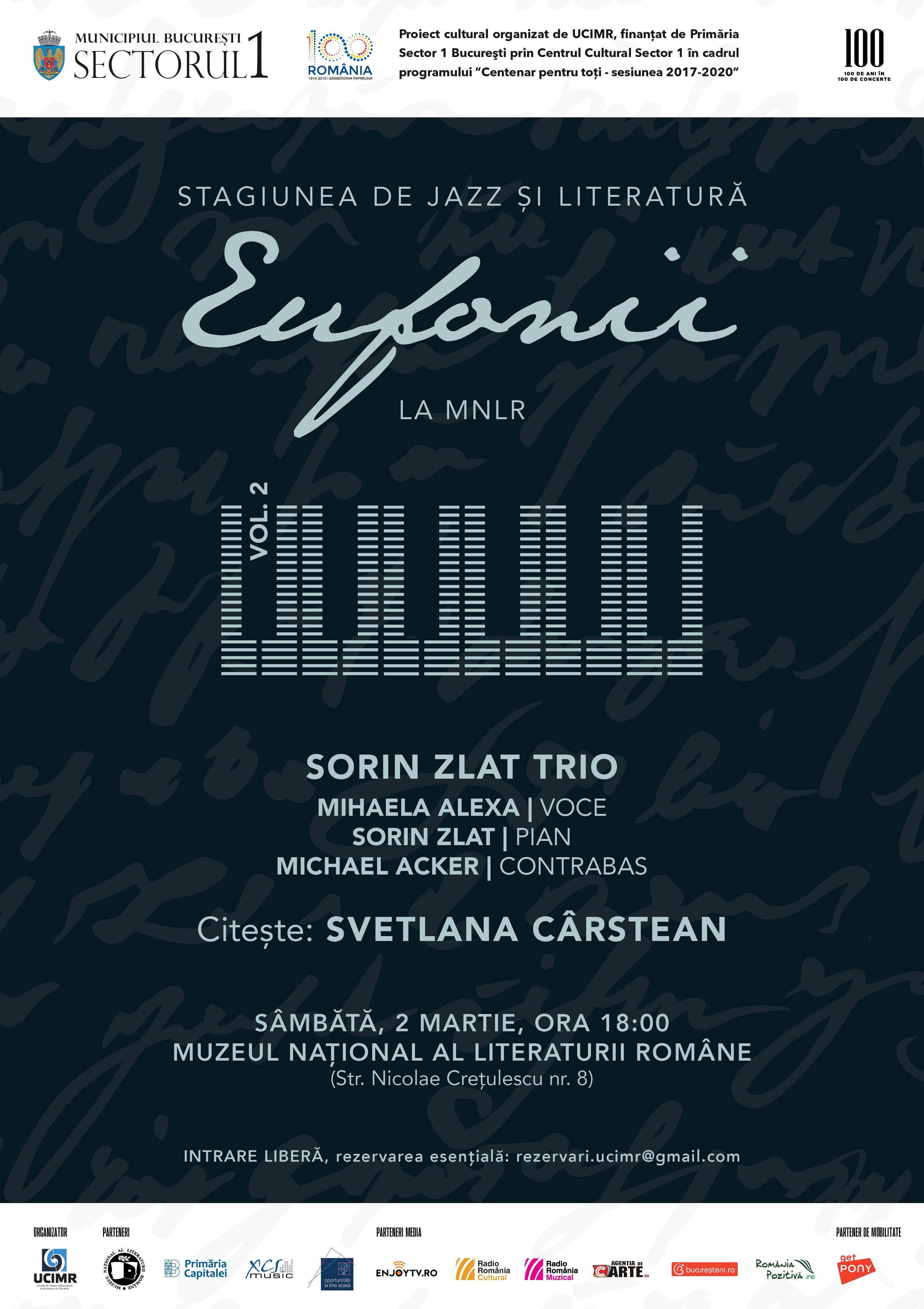 Stagiunea de jazz şi literatură „Eufonii la MNLR” va continua sâmbătă, 2 martie 2019, de la ora 18:00 printr-un nou concert-eveniment, invitati fiind membrii formaţiei Sorin Zlat Trio, unul dintre band-urile de referinţă ale jazz-ului autohton. Alături de ei va fi scriitoarea Svetlana Cârstean care va citi din cele mai recente scrieri.
