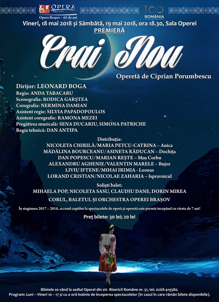 Luna aceasta, Opera din Braşov a inclus în repertoriul său premiera operetei „Crai Nou” de Ciprian Porumbescu, pe textul piesei poetului Vasile Alecsandri, eveniment ce stă sub semnul Centenarului Marii Uniri. Braşovul este indisolubil legat de premiera absolută a acestei lucrări, care a avut pe 27 februarie 1882, în Sala Festivă a Gimnaziului Român (astăzi Colegiul Naţional „Andrei Şaguna”), pe o scenă improvizată.