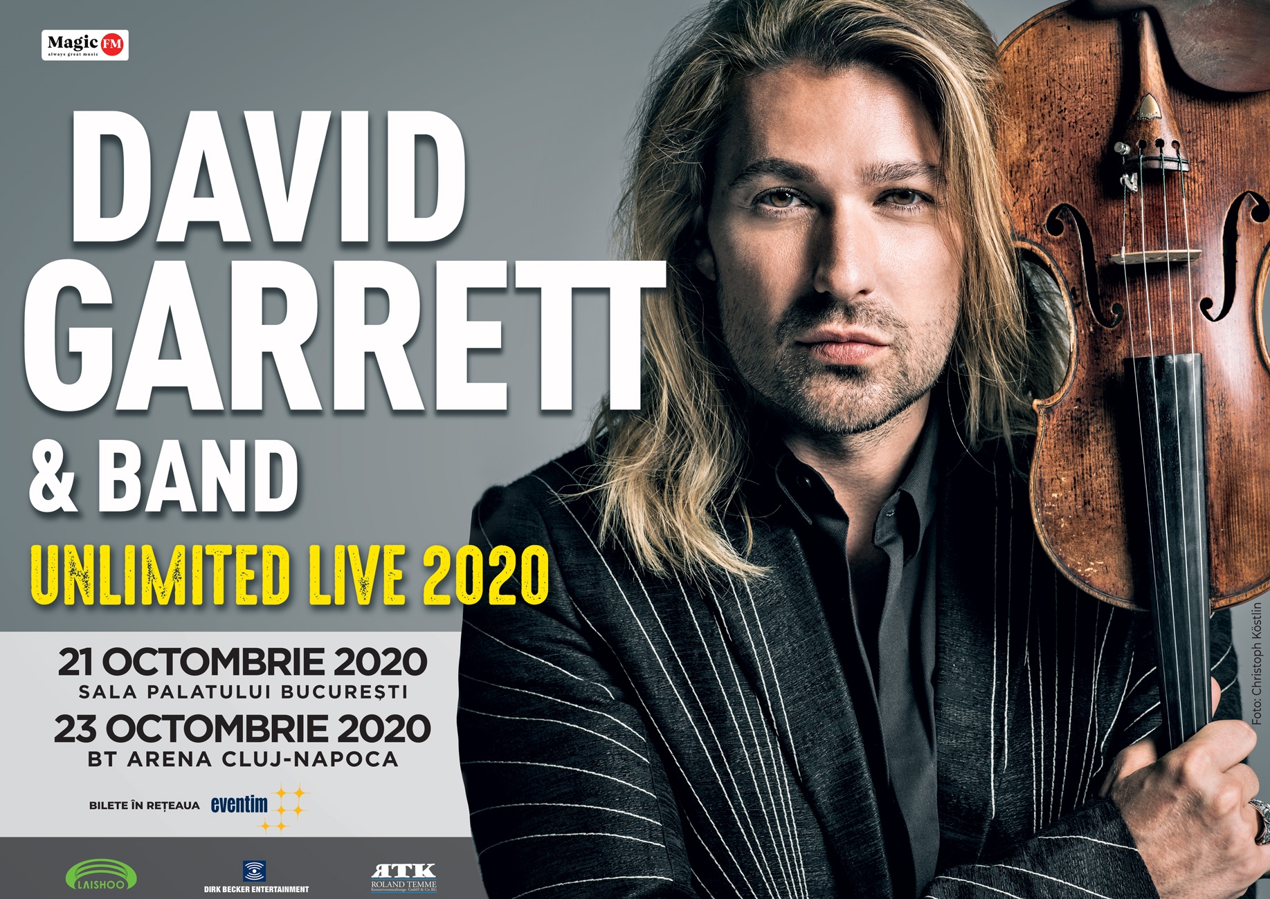 David Garett, superstarul internaţional care a cucerit publicul din România, în anul 2018, cu două reprezentaţii sold-out ale concertului ,,Explosive Live”, precum şi cu programele extraordinare de muzică clasică din cadrul Festivalului Internaţional George Enescu, revine în 2020 pentru două concerte fabuloase la Bucureşti şi Cluj-Napoca. Concertele fac parte din cadrul turneului mondial „Unlimited Live” şi vor avea loc pe 21 octombrie 2020, la Sala Palatului din Capitală, iar pe 23 octombrie 2020, la BT Arena din Cluj-Napoca.