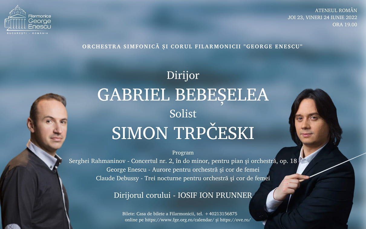 Joi, 23 și vineri, 24 iunie 2022, Orchestra simfonică a Filarmonicii „George Enescu” va fi condusă de dirijorul principal Gabriel Bebeșelea, în două concerte cu public, desfășurate de la ora 19.00, în Sala mare a Ateneului Român. Programul este alcătuit din Concertul nr. 2, în do minor, pentru pian şi orchestră, op. 18 de Serghei Rahmaninov, cu solistul macedonean Simon Trpčeski, Trei nocturne pentru orchestră şi cor de femei de Claude Debussy și L’Aurore pentru orchestră şi cor de femei de George Enescu. Corul Filarmonicii „George Enescu” va fi coordonat de Iosif Ion Prunner.