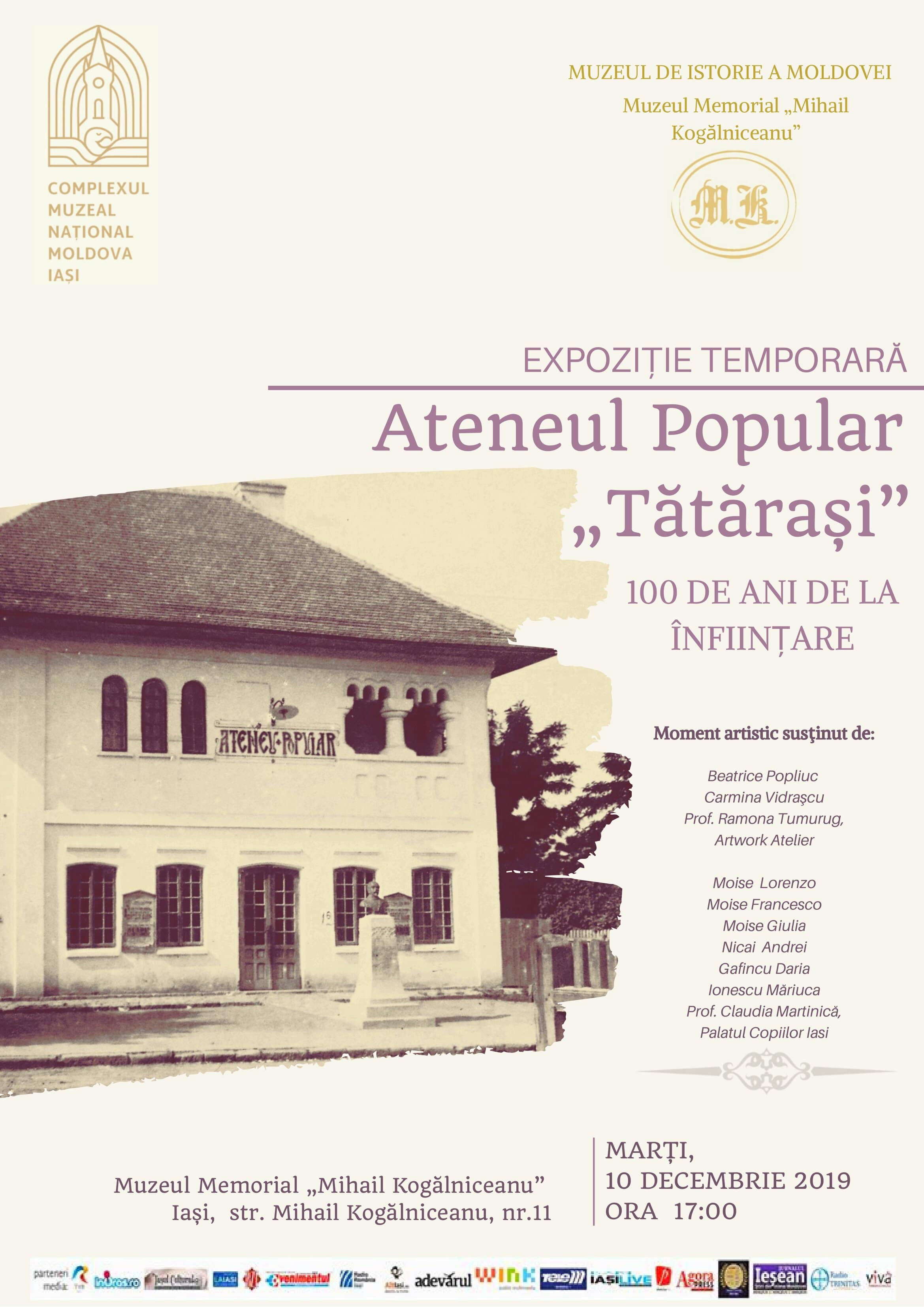 Complexul Muzeal Naţional „Moldova” Iaşi – Muzeul de Istorie a Moldovei organizează, la Muzeul Memorial „Mihail Kogălniceanu” din Iaşi, în perioada 10 decembrie 2019 – 15 februarie 2020, expoziţia temporară „Ateneul Popular Tătăraşi – 100 de ani de la înfiinţare”.