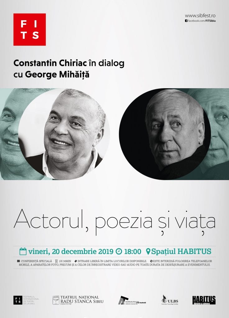George Mihăiţă, unul dintre cei mai cunoscuţi şi îndrăgiţi actori de teatru şi film din România, este invitatul ultimei conferinţe speciale FITS şi TNRS din 2019, care va avea loc vineri, 20 decembrie 2019, de la ora 18:00, la Spaţiul Habitus, Piaţa Mică. „Actorul, poezia şi viaţa” este tema acestei conferinţe.