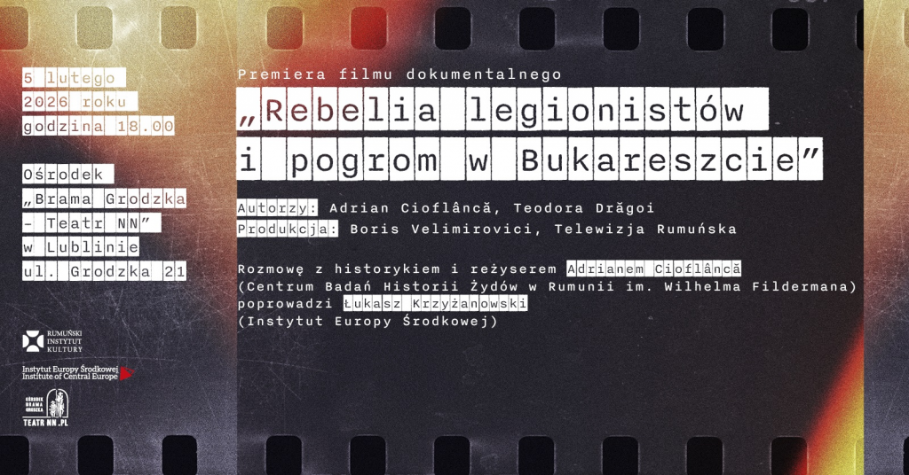 Institutul Cultural Român de la Varșovia, împreună cu Centrul Brama Grodzka – Teatr NN și Institutul Europei Centrale din Lublin, organizează joi, 5 februarie 2026, la ora 18:00, la Sala Czarna a Centrului Brama Grodzka – Teatr NN din Lublin, o întâlnire cu istoricul român Adrian Cioflâncă, dedicată unei pagini întunecate a istoriei anului 1941 – Rebeliunea legionară și Pogromul de la București. Întâlnirea va fi moderată de istoricul Łukasz Krzyżanowski.