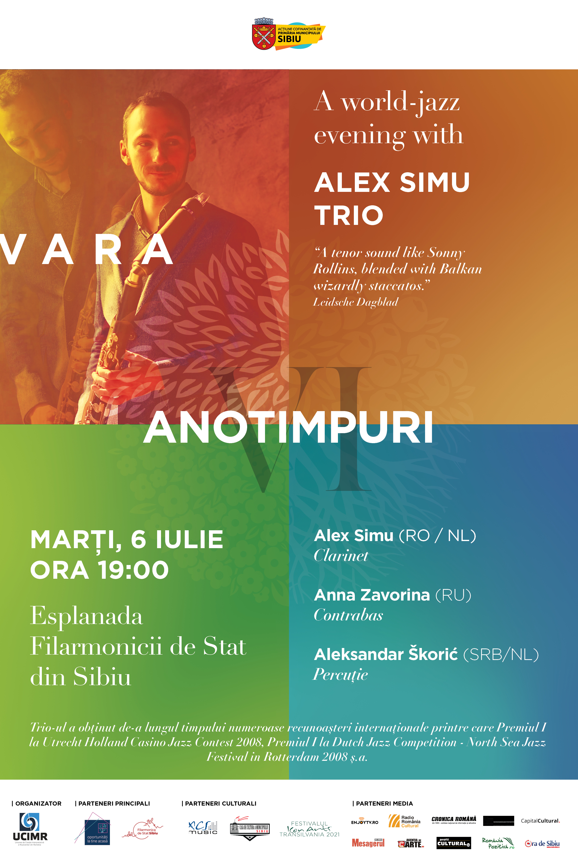 Clarinetist, saxofonist, compozitor și producător de muzică de film de renume internațional, Alex Simu se numără printre cei mai apreciați muzicieni de jazz ai prezentului. Artistul stabilit în Olanda va concerta în aer liber, în formulă de trio, marți, 6 iulie 2021, de la ora 19:00, la Sala Thalia a Filarmonicii din Sibiu. Alături de el vor urca pe scenă Anna Zavorina – contrabas și Aleksandar Škorić - percuție, artiști invitați din Rusia, respectiv Serbia.