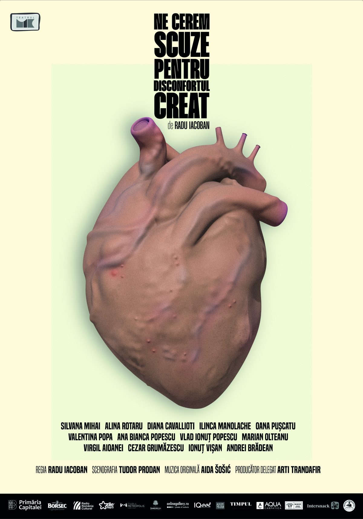 Teatrul Mic prezintă prima premieră oficială a stagiunii 2025-2026 – Ne cerem scuze pentru disconfortul creat, spectacol scris și regizat de Radu Iacoban, scenografia Tudor Prodan, muzica originală Aida Šošić. Evenimentul va avea loc sâmbătă, 20 septembrie, ora 19:00 și duminică, 21 septembrie 2025, ora 19:00, la Sala Studio – Strada Gabroveni nr. 57.