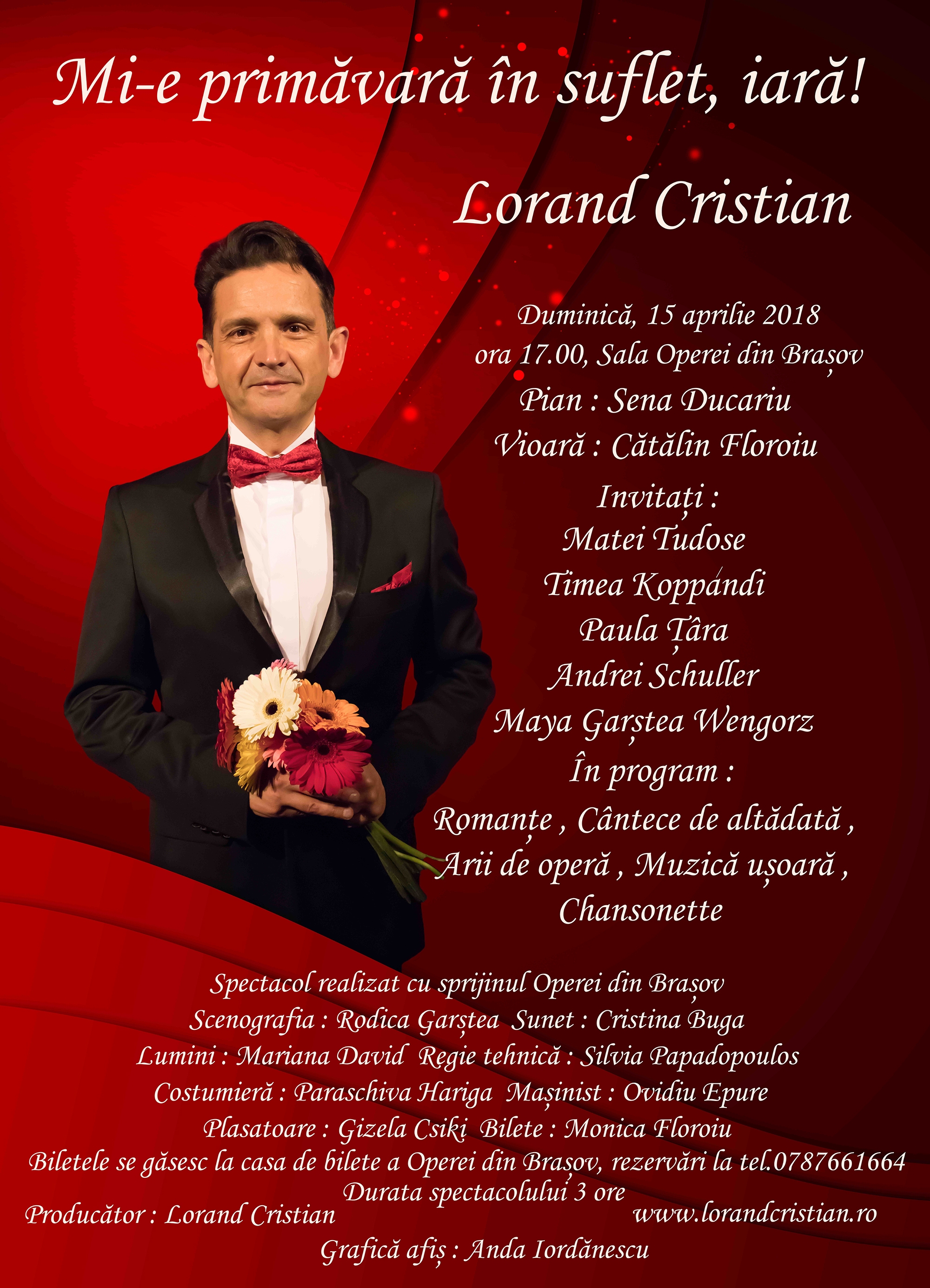 Duminică 15 aprilie, de la ora 17.00, la Opera Braşov va avea loc un spectacol extraordinar dedicat muzicii româneşti de odinioară susţinut de Lorand Cristian. În prima parte a concertului solistul interpreta cântece de neuitat,  acompaniat la pian de Sena Ducariu şi la vioară de Cătălin Floroiu. Piesele din prima parte sunt romanţe româneşti, melodii de muzică uşoară şi cântece de petrecere, aparţinând unor mari compozitori români: Gherase Dendrino, Nicolae Kirculescu, Emanuel Ionescu, Vasile Vasilache jr., Sergiu Malagamba, Radu Şerban, Edmond Deda, Ion Vasilescu, George Grigoriu, Emil Gavriş. Versurile de o mare frumuseţe au fost scrise de Aurel Felea, Flavia Buref, Eugen Mirea, Harry Negrin, Nicolae Chiriţescu, Romeo Iorgulescu, Angel Grigoriu, Puiu Maximilian, toţi textieri renumiţi pe vremuri.