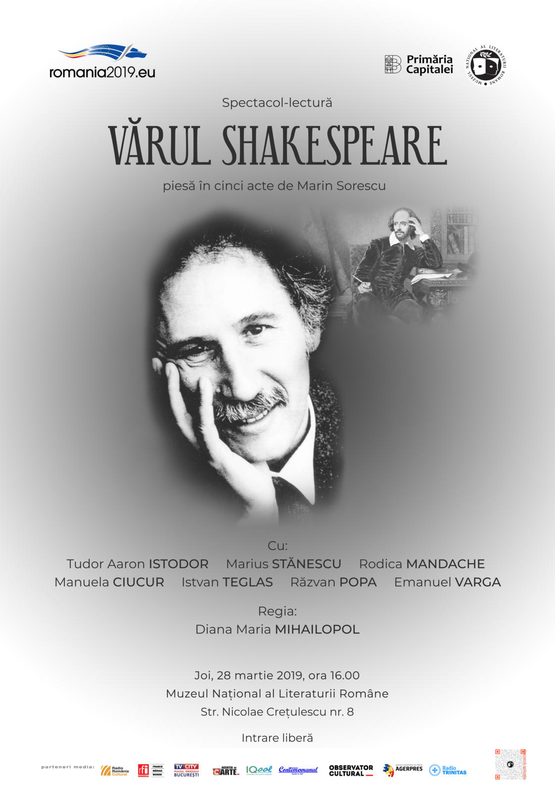 Muzeul Naţional al Literaturii Române vă invită joi, 28 februarie 2018, de la ora 16.00, la spectacolul-lectură „Vărul Shakespeare”, piesa în cinci acte de Marin Sorescu, la sediul MNLR din Str. Nicolae Creţulescu nr. 8 (în spatele Bisericii Albe). Evenimentul este dedicat memoriei lui Marin Sorescu, de la a cărui naştere se împlinesc 83 de ani.