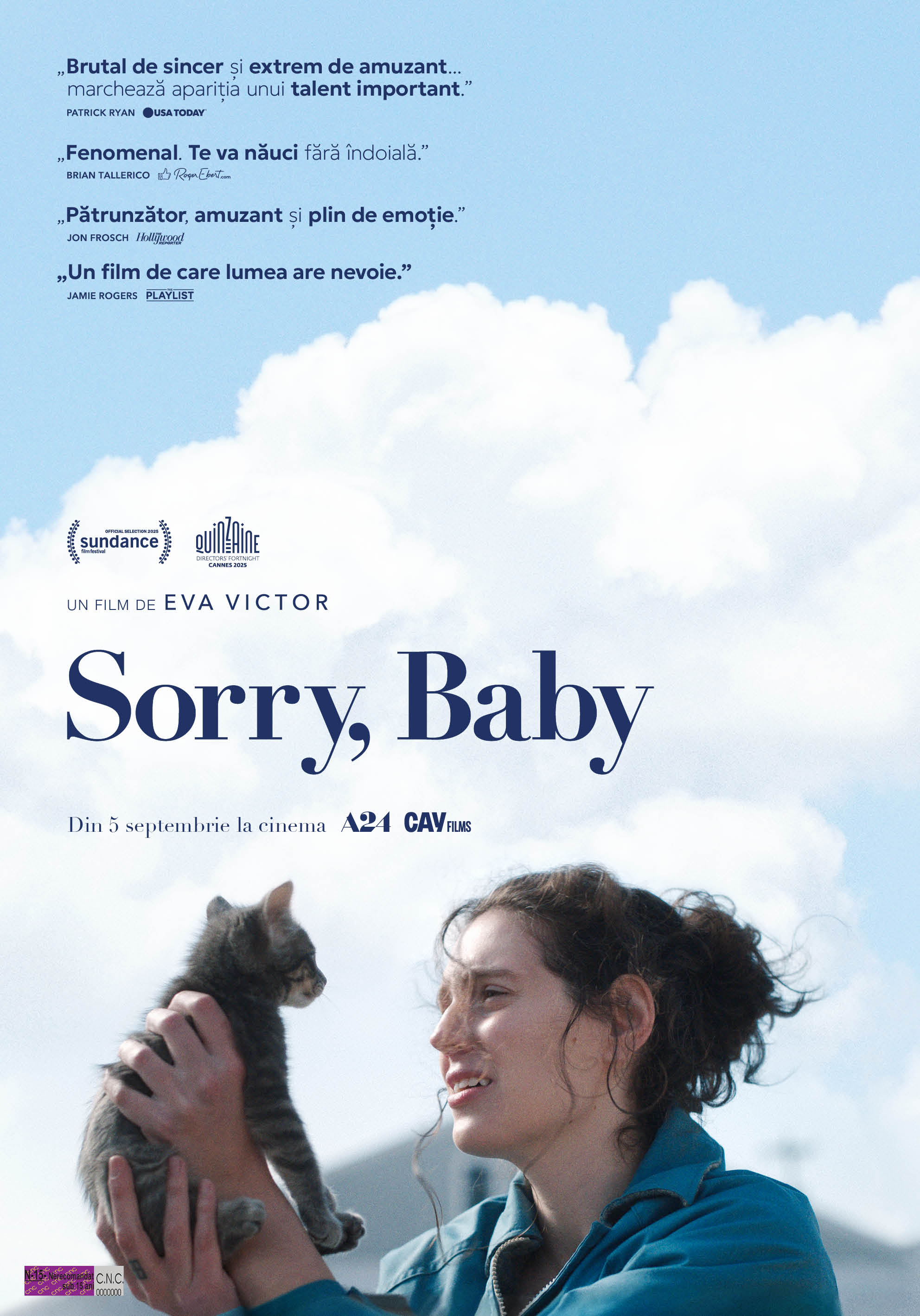 CAY Films aduce din 5 septembrie în cinematografe filmul Sorry, Baby – scris și regizat de actrița de origine americană, Eva Victor care și joacă în „remarcabilul său debut regizoral, o explorare intimă, amuzantă și sfâșietoare a experienței post-traumatice și a conflictului interior ce se instaurează adesea în astfel de situații. Schimbările abile de ton, tușa nuanțată a povestirii și interpretările firești anunță sosirea unei actrițe și regizoare fascinante.” scriau cei de la Pitchfork după premiera în competiția de la Sundance unde filmul a fost distins cu Premiul pentru scenariu Waldo Salt.