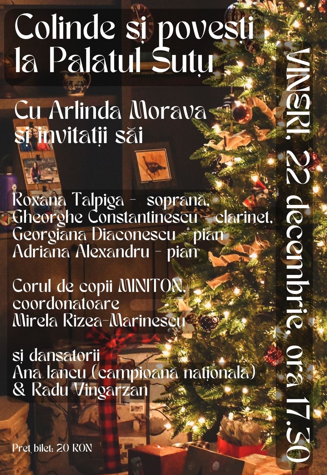 Muzeul Municipiului București oferă publicului la Palatul Suțu (Bulevardul Ion C. Brătianu 2), în ziua de vineri, 22 decembrie 2023, ora 17.30, un Concert special de Crăciun, susținut de soprana Arlinda Morava și invitații săi: Roxana Tălpigă – soprană, Gheorghe Constantinescu – clarinet, Georgiana Diaconescu – pian, Adriana Alexandru – pian, Corul de copii MINITON (coordonatoare Mirela Rizea Marinescu)și dansatorii Ana Iancu & Radu Vingarzan.