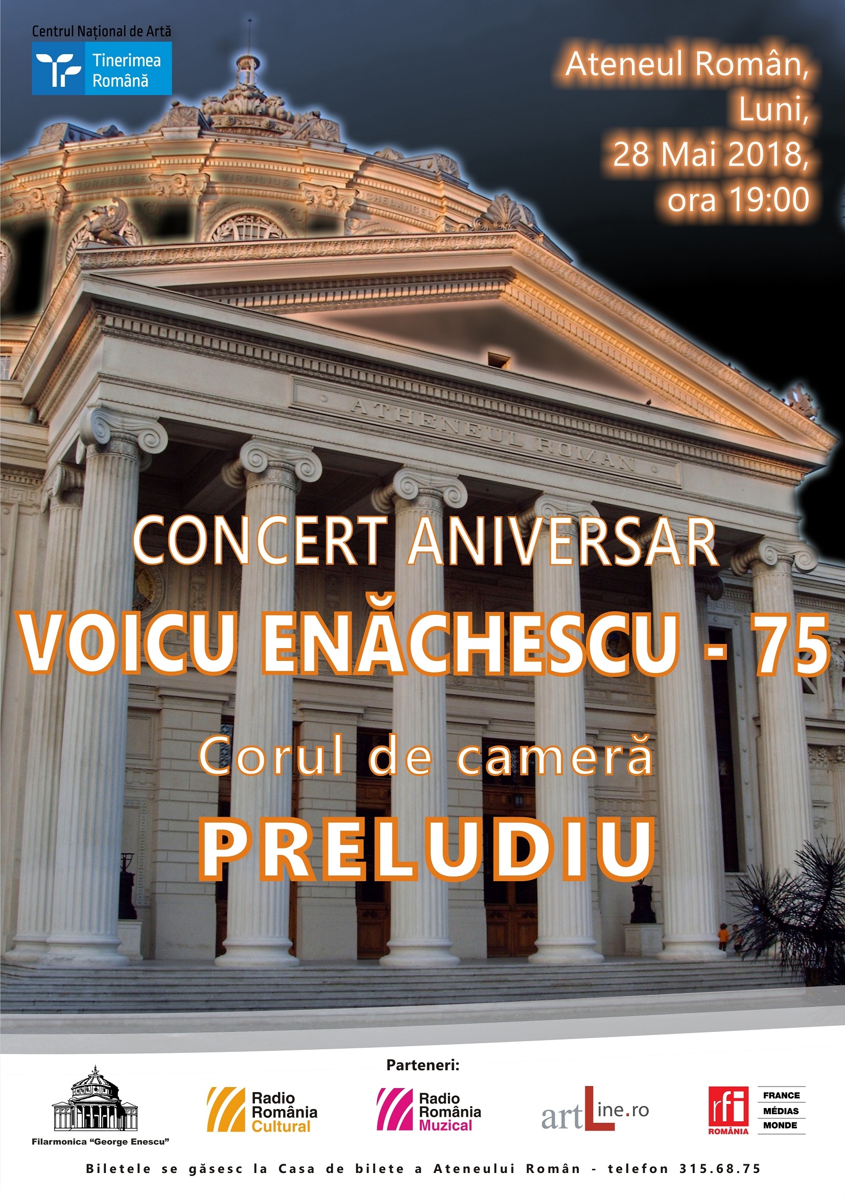 Corul de Cameră Preludiu al Centrului Naţional de Artă “Tinerimea Română” va susţine la Ateneul Român luni, 28 mai, de la ora 19.00 un concert dedicat sărbătoririi dirijorului Voicu Enăchescu, formatorul şi dirijorul corului de peste 45 de ani, cu titlul Voicu Enăchescu 75 de ani!, eveniment organizat în colaborare cu Filarmonica “George Enescu”.