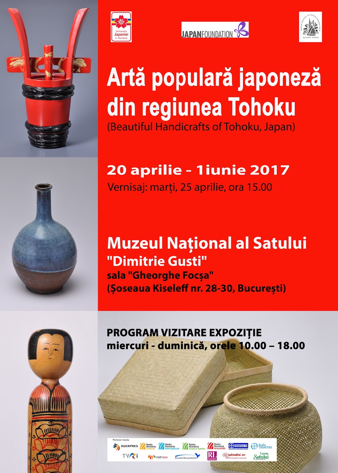 Ambasada Japoniei, Japan Foundation şi Muzeul Naţional al Satului ”Dimitrie Gusti” vă invită la expoziţia “Artă populară japoneză din regiunea Tohoku” care va fi deschisă în perioada 20 aprilie – 1 iunie 2017 la Muzeul Naţional al Satului ”Dimitrie Gusti” – sala Gh. Focşa din Bucureşti (Şoseaua Kiseleff nr. 28)