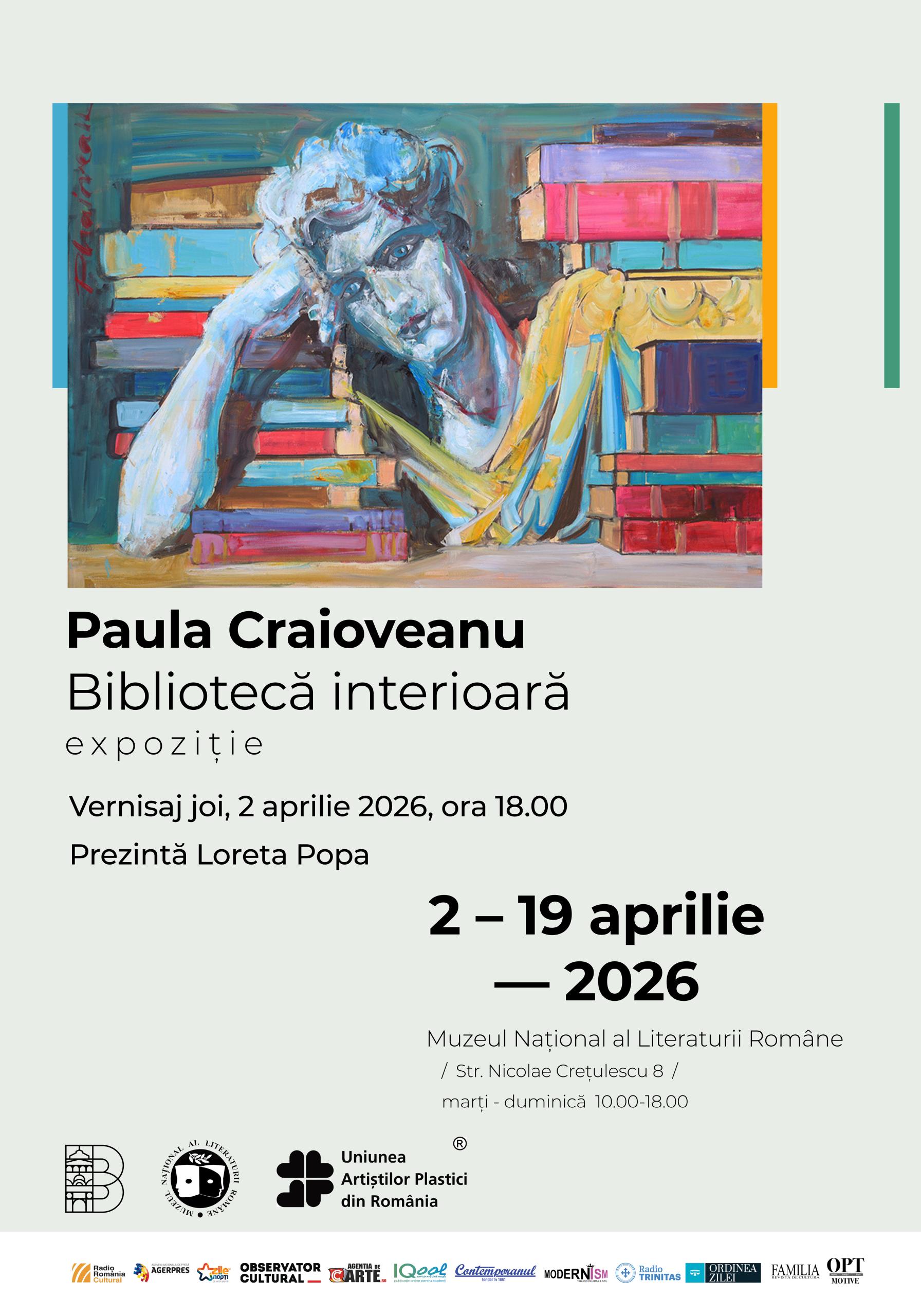 Muzeul Național al Literaturii Române vă invită la expoziția de pictură „Bibliotecă interioară”, semnată de artista Paula Craioveanu. Vernisajul va avea loc joi, 2 aprilie 2026, ora 18:00, iar prezentarea expoziției va fi susținută de Loreta Popa. Evenimentul se desfășoară la sediul muzeului din Str. Nicolae Crețulescu nr. 8, București, iar intrarea este liberă.