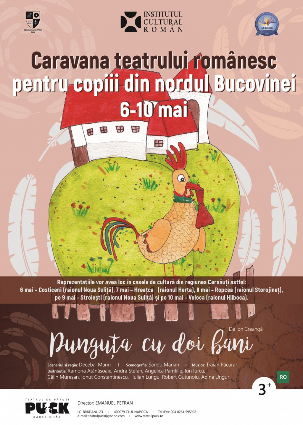 „Caravana teatrului românesc pentru copiii din nordul Bucovinei“, proiect derulat de Institutul Cultural Român, prin Compartimentul Comunităţi Istorice, în perioada 6-10 mai 2019, va poposi în mai multe localităţi din regiunea Cernăuţi după următorul program: 6 mai – Costiceni (raionul Noua Suliţă), 7 mai – Hreaţca (raionul Herţa), 8 mai – Ropcea (raionul Storojineţ), 9 mai – Stroieşti (raionul Noua Suliţă) şi 10 mai – Voloca (raionul Hliboca).