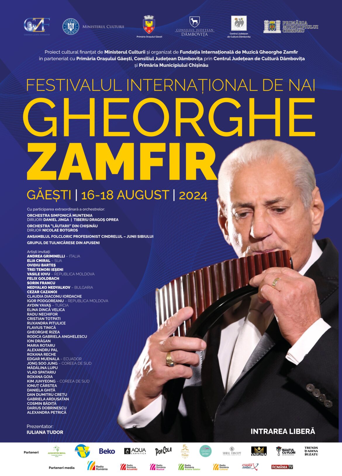 Fundația Internațională de Muzică „Gheorghe Zamfir”, în parteneriat cu Primăria Orașului Găești, Consiliul Județean Dâmbovița prin Centrul Județean de Cultură Dâmbovița și Primăria Orașului Chișinău, organizează Festivalul Internațional de Nai “Gheorghe Zamfir” ediția a VI-a, care va avea loc la Găești, județul Dâmbovița, în perioada 16 – 18 august 2024.