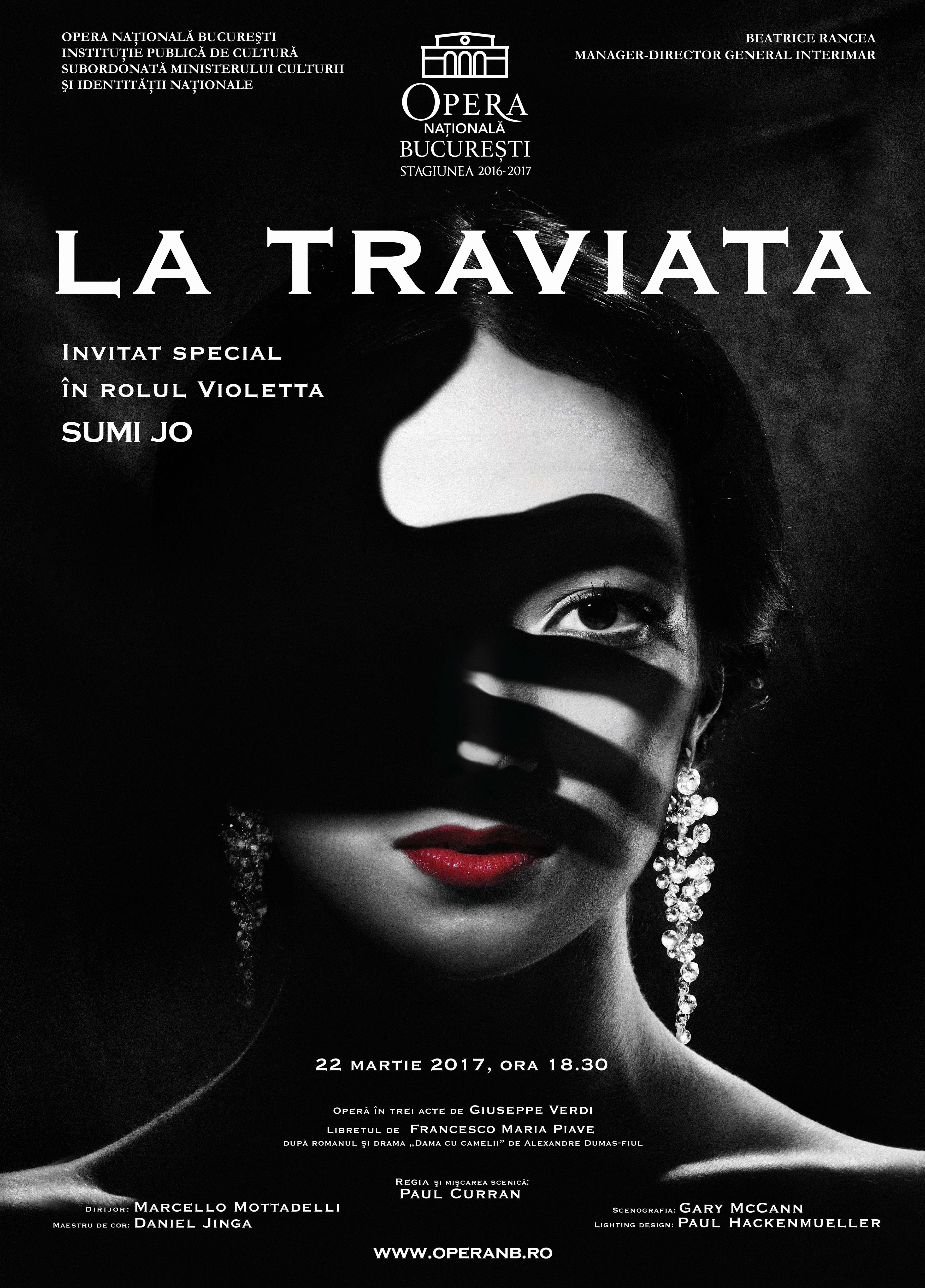 Spectacolul “La Traviata”, de Giuseppe Verdi, din 22 martie din Bucureşti se va desfăşura sub bagheta dirijorală a Maestrului Marcello Mottadelli, Coordonatorului Artistic al Operei Naţionale Bucureşti. Regia şi mişcarea scenică sunt semnate de Paul Curran, scenografia de către Gary McCann, designul de lumini de către Paul Hackenmueller, cu Daniel Jinga ca maestru de cor. Alături de soprană vor evolua tenorul Valter Borin în rolul lui Alfredo Germont, Ştefan Ignat în rolul Giorgio Germont.