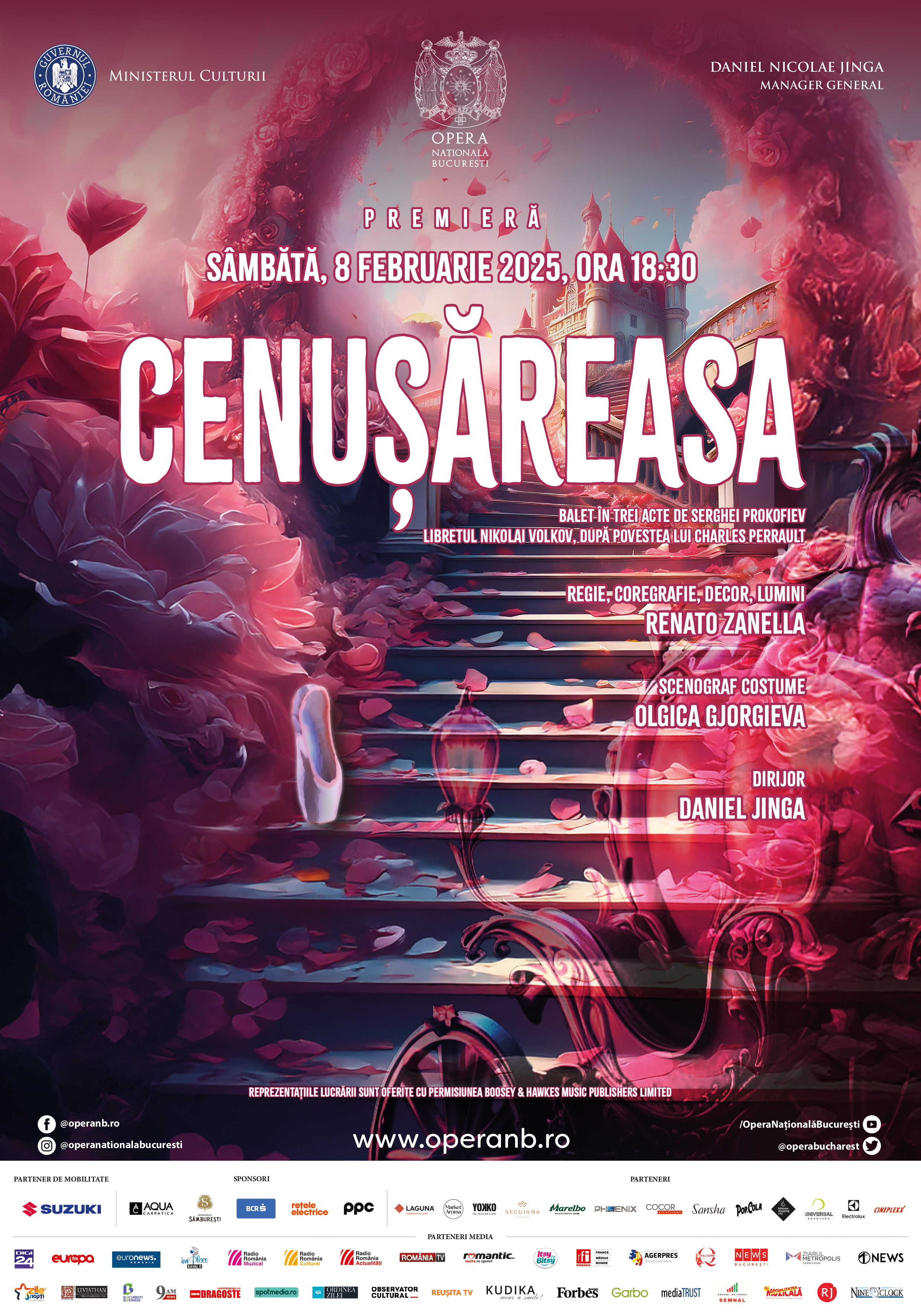 Opera Națională București prezintă în luna dedicată iubirii, pe 8 februarie, ora 18:30, premiera de balet „Cenușăreasa” de Serghei Prokofiev, o poveste despre triumful binelui, puterea dragostei adevărate și speranța care poate transforma chiar și cele mai grele încercări într-un final fericit. Regia și coregrafia poartă semnătura lui Renato Zanella. La pupitrul dirijoral se va afla maestrul Daniel Jinga. Pentru prima reprezentație cu titlu de premieră protagoniștii vor fi prim-balerinii Cristina Dijmaru și Bogdan Cănilă, cu participarea Ansamblului de Balet și a Orchestrei Operei Naționale București.