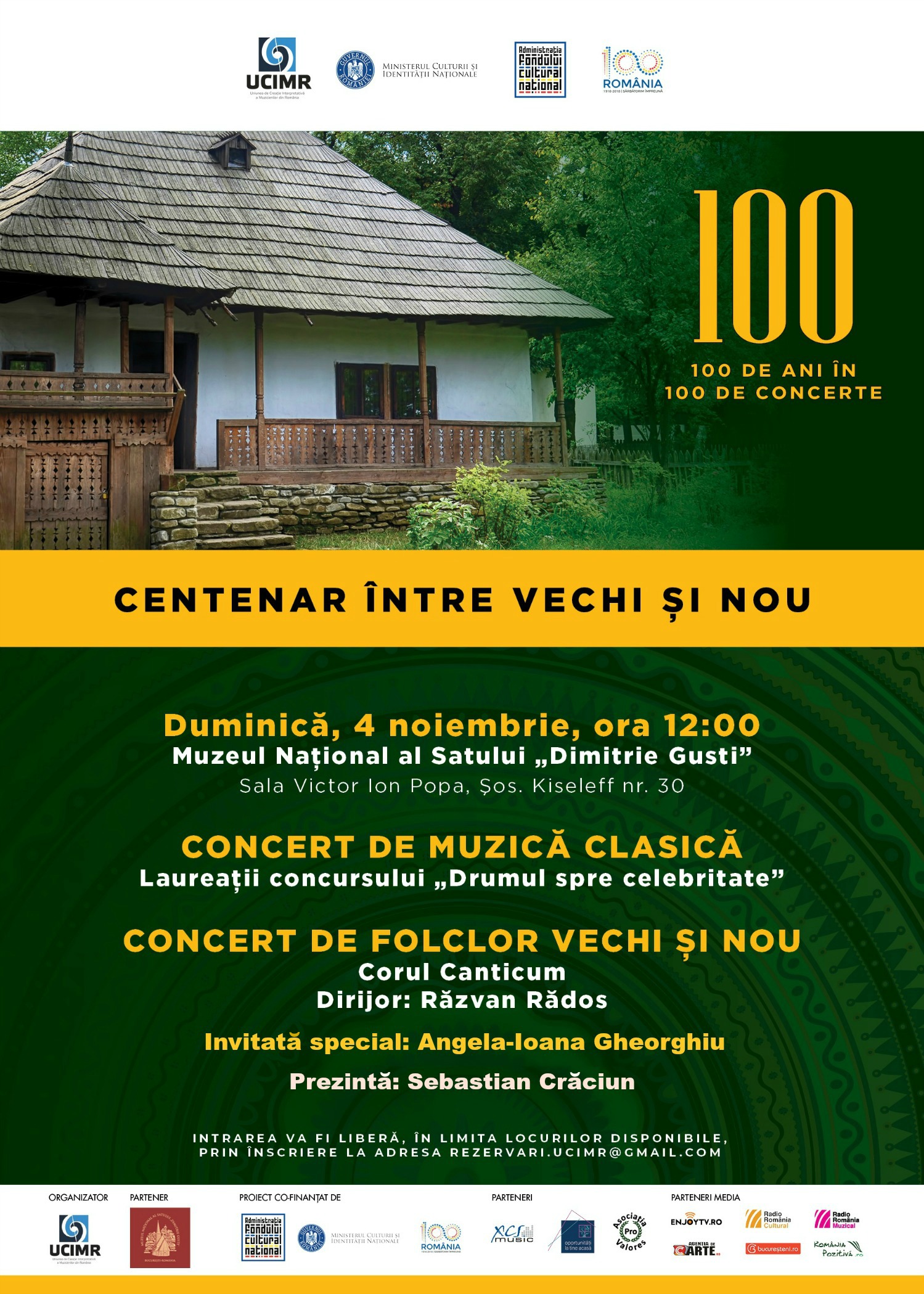 Duminică, 4 noiembrie, de la ora 12:00, publicul bucureștean este invitat la Muzeul Național al Satului „Dimitrie Gusti” la un nou eveniment parte din proiectul „100 de ani în 100 de concerte” organizat de UCIMR pentru a sărbători Centenarul alături de public și cei mai buni artiști ai momentului, dar și alături de tinere talente aflate în plină afirmare.