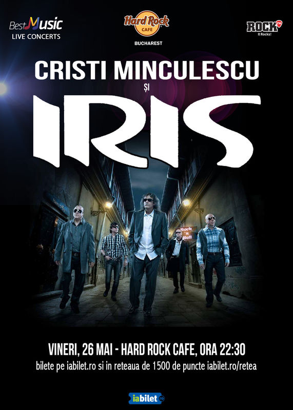 Cu 19 materiale discografice lansate, nenumărate clipuri şi o serie de prestigioase distincţii ale industriei muzicale în palmares, IRIS scrie pagini din istoria rockului românesc de peste 35 de ani. Pe 16 martie va urca pe scena din Hard Rock Cafe în formula sa de aur, care îi include pe: Cristi Minculescu (voce), Nelu Dumitrescu (tobe), Valter Popa (chitară), Doru Borobeică (bass) şi Relu Marin (keyboards).