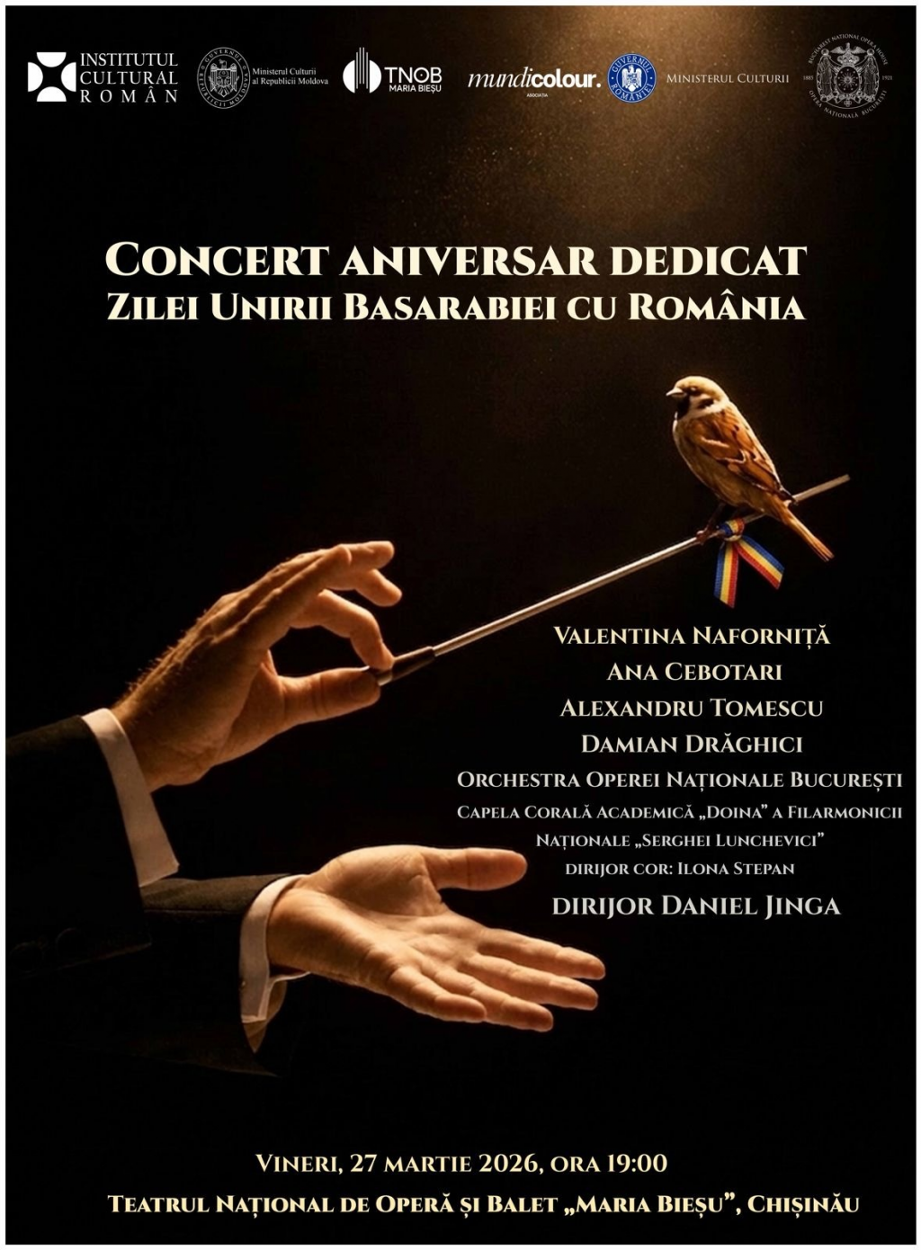 De Ziua Unirii Basarabiei cu România, moment istoric de referință pentru identitatea și unitatea culturală românească, Institutul Cultural Român, în parteneriat cu Ministerul Culturii din Republica Moldova, organizează concertul Orchestrei Operei Naționale București, instituție subordonată Ministerului Culturii din România, vineri, 27 martie, ora 19.00, la Teatrul Național de Operă și Balet „Maria Bieșu” din Chișinău.