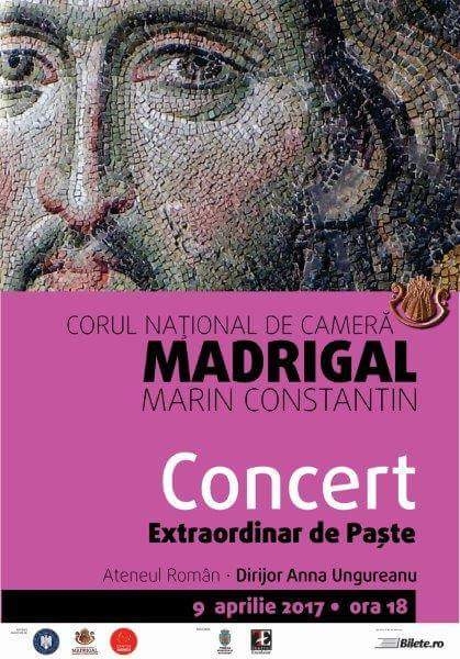 Duminică, 9 aprilie 2017, începând cu ora 18:00, Sala Mare a Ateneului Român găzduieşte Concertul Extraordinar de Paşti, susţinut de Corul Naţional de Cameră “Madrigal – Marin Constantin”. Dirijat de Anna Ungureanu, evenimentul este una dintre tradiţiile preţioase ale Corului, desfăşurându-se, fără întrerupere, de mai bine de jumătate de secol. Biletele sunt disponibile în reţeaua bilete.ro şi au preţuri care variază între 50 şi 250 RON.