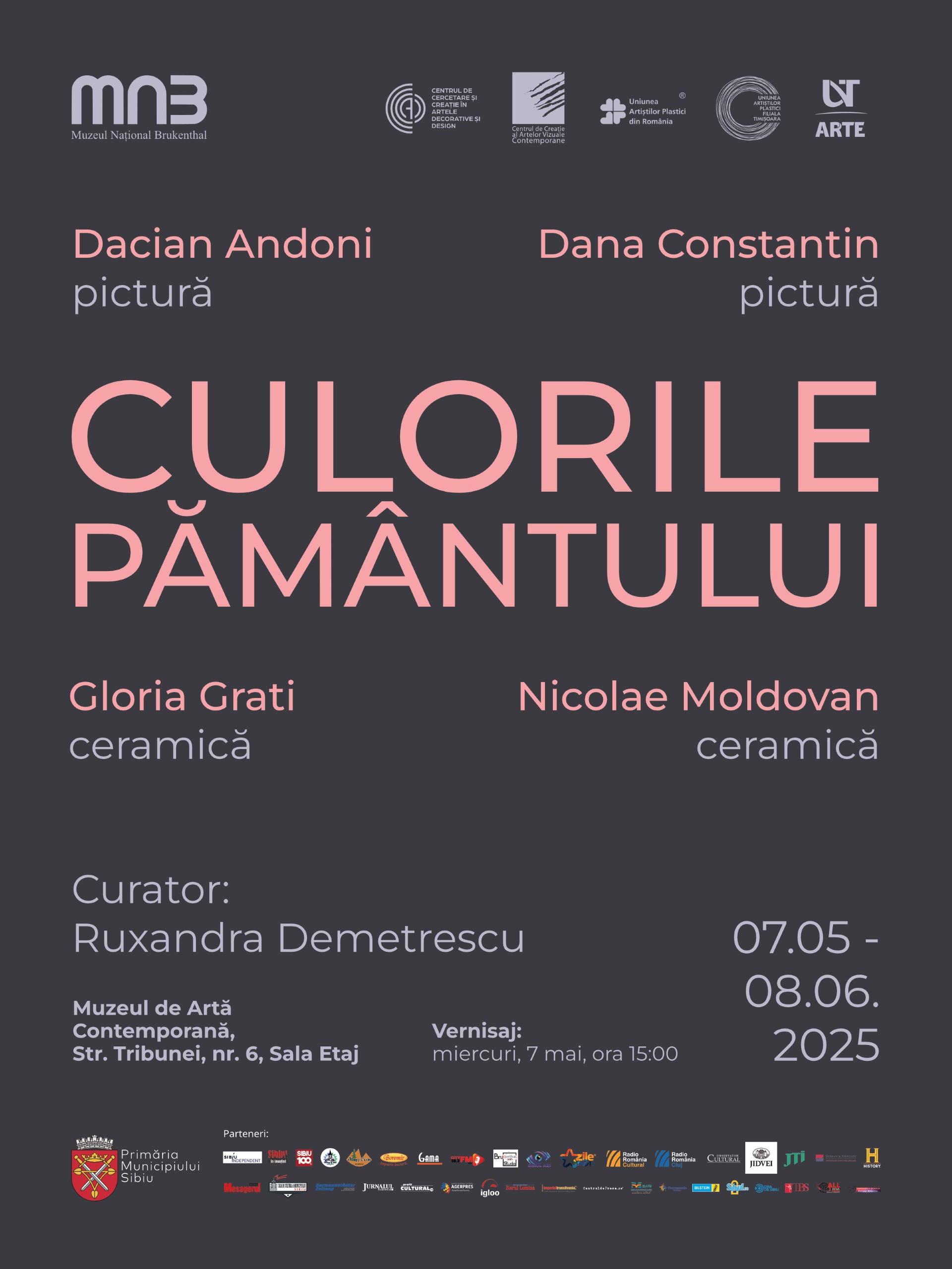 Muzeul Național Brukenthal prezintă publicului, în spațiul dedicat artei contemporane, patru artiști timișoreni, profesori în cadrul Facultății de Arte Vizuale și Design a Universității de Vest. Reuniți în expoziția Culorile pământului, aceștia cultivă deliberat echilibrul între artele plastice (pictura, reprezentată de Dana Constantin și Dacian Andoni) și artele decorative (ceramica, reprezentată de Gloria Grati și Nicolae Moldovan), puse într-un dialog de egalitate ce anulează ierarhia tradițională dintre artele „majore” și cele „minore”. Într-o altă lectură, făcută din perspectiva egalității de gen, se poate observa echilibrul configurat de prezența a două artiste – o pictoriță și o ceramistă – (Dana Constantin și Gloria Grati) și doi artiști – un pictor și un ceramist – (Dacian Andoni și Nicolae Moldovan). Sub aceste auspicii favorabile, a fost creat un proiect vizual ce și-a propus să evidențieze preocupările formale comune celor patru artiști, altminteri diferiți ca viziune și voință artistică: impulsul de a experimenta necontenit cu tehnicile și materialele specifice și cultivarea dimensiunii vizual-haptice a lucrărilor/obiectelor create.