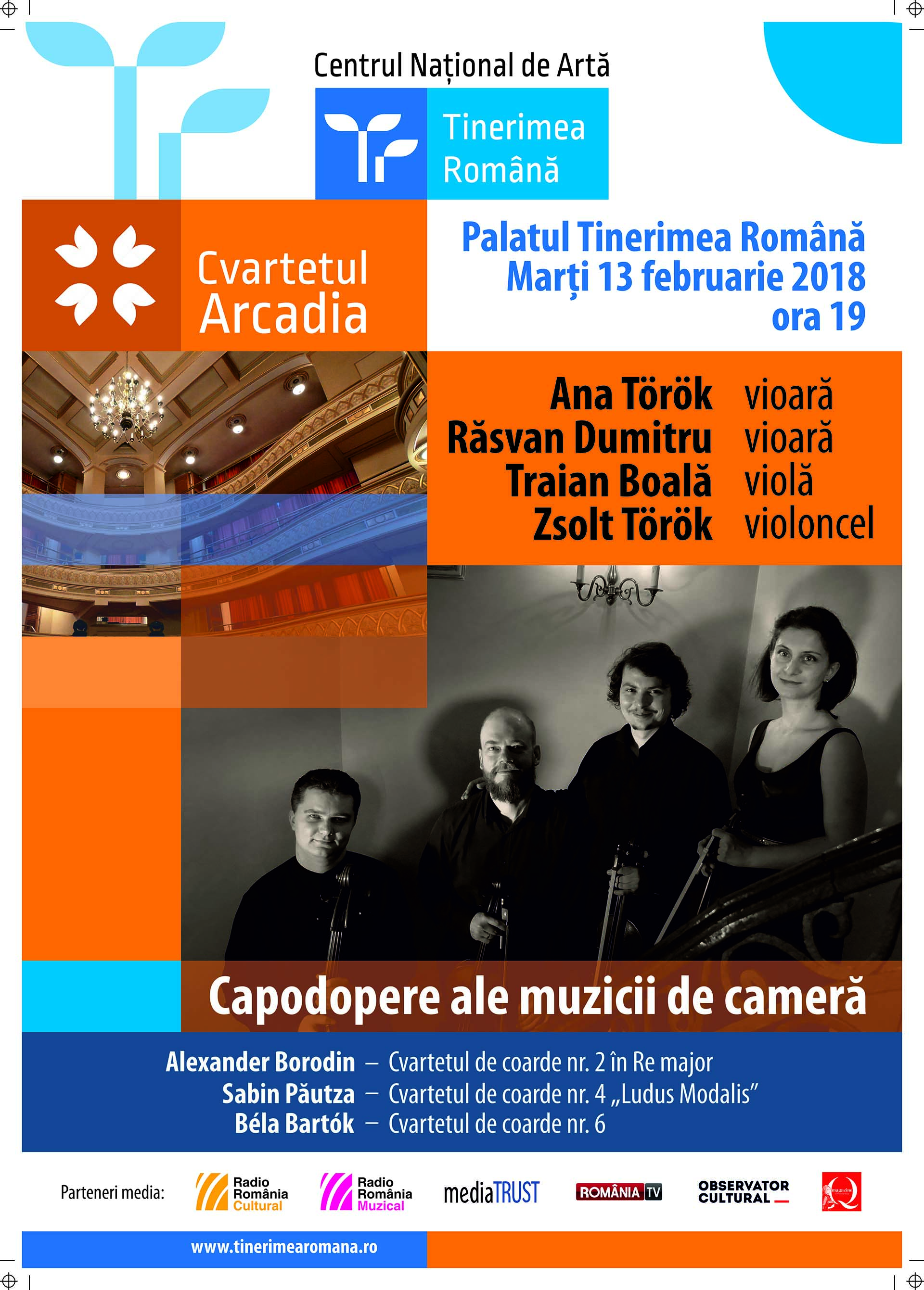 Centrul Naţional de Artă Tinerimea Română invită publicul marţi, 13 februarie 2018, de la ora 19, la Palatul Tinerimea Română şi miercuri, 14 februarie 2018, de la ora 19, la Ateneul Român, la recitalul Cvartetului Arcadia, compus din Ana Török – vioară, Răsvan Dumitru – vioară, Traian Boală – violă şi Zsolt Török – violoncel.