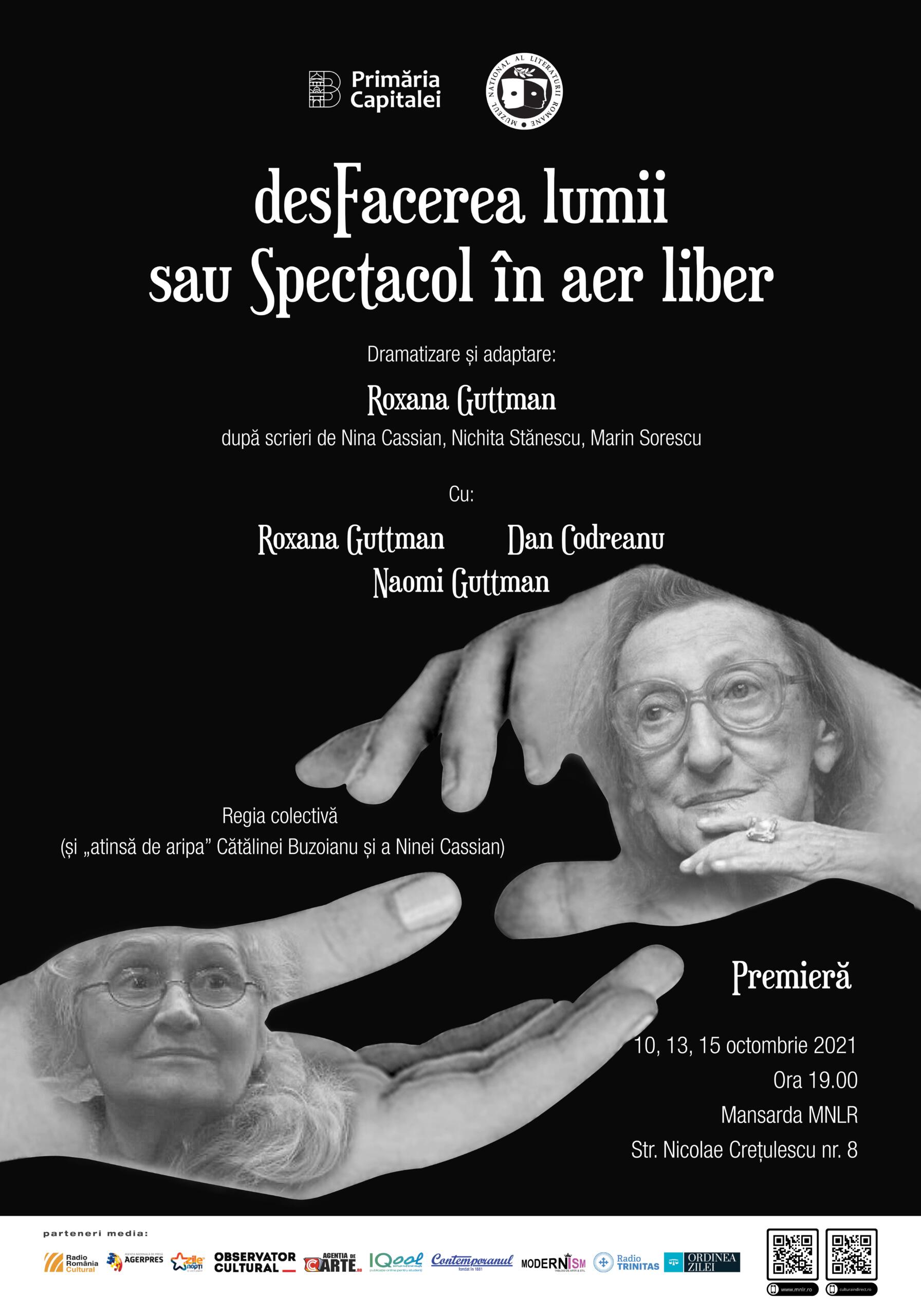 Muzeul Național al Literaturii Române vă invită duminică, 10 octombrie 2021 (dar și miercuri, 13 octombrie 2021 și vineri, 15 octombrie 2021), de la ora 19.00, în Mansarda MNLR, Str. Nicolae Crețulescu nr. 8, la premiera spectacolului „DesFacerea lumii sau Spectacol în aer liber”, după Nina Cassian, cu inserții poetice semnate Nichita Stănescu și Marin Sorescu.