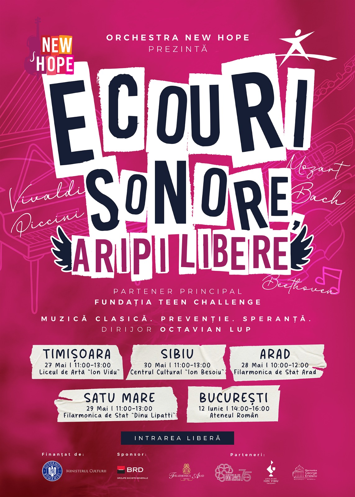 Între 27 mai și 12 iunie, cinci orașe din țară găzduiesc un proiect național de cultură și educație dedicat adolescenților. „Ecouri Sonore, Aripi Libere” este un program care care folosește muzica clasică drept context de întâlnire pentru mărturii de viață și dialoguri esențiale despre riscurile consumului de alcool și droguri. Proiectul este inițiat de New Hope Orchestra în parteneriat cu Fundația Teen Challenge România și finanțat de Ministerul Culturii.