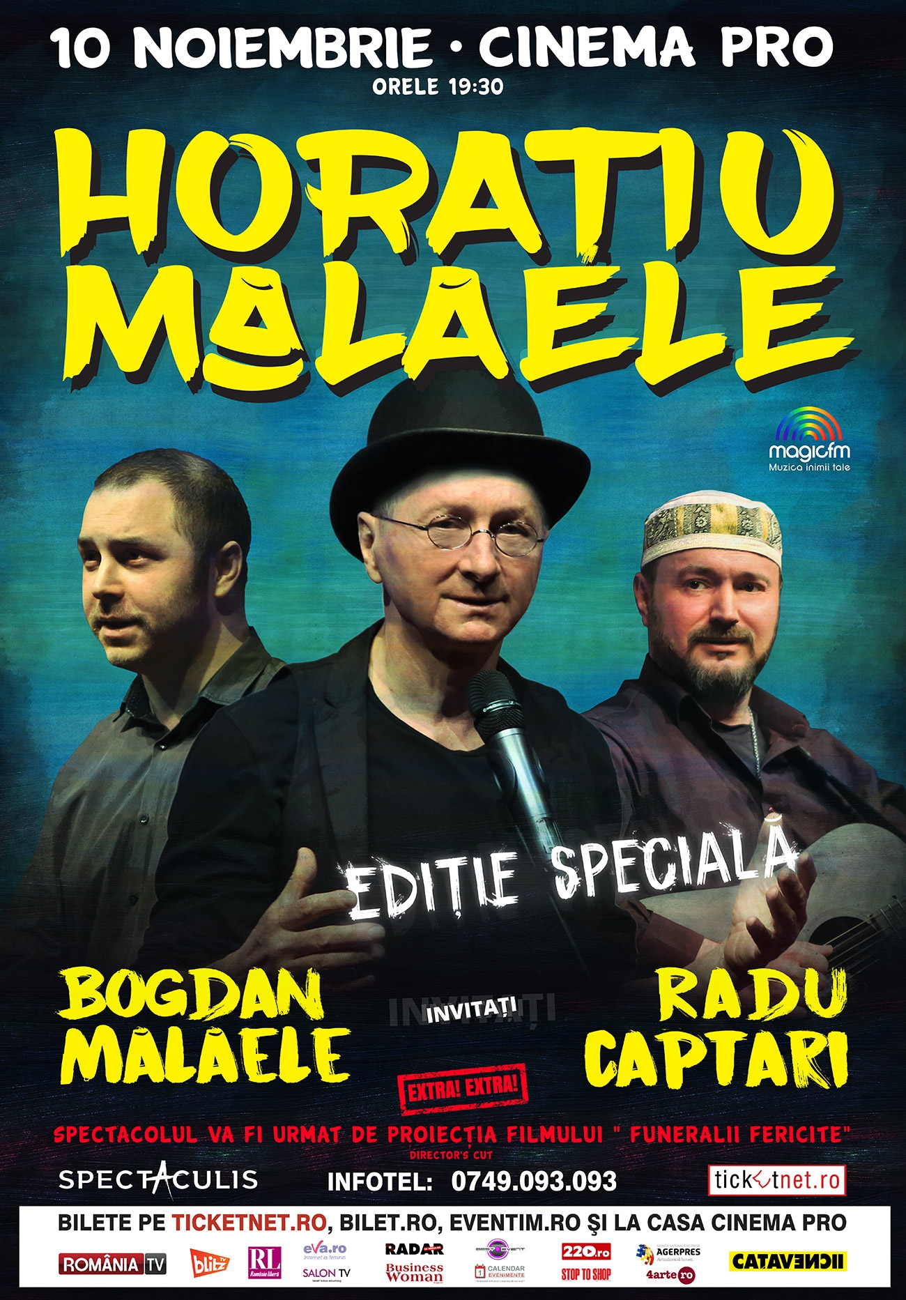 Spectatorii bucureşteni care vor alege să petreacă un început de week-end în compania protagoniştilor spectacolului ”Ediţie Specială”, la Cinema PRO Bucureşti, vor beneficia de vizionarea filmului ”Funeralii Fericite”, în mod gratuit. Pelicula este o tragi-comedie excepţională ce îl aduce pe Horaţiu Mălăele atât în ipostaza de actor, cât şi în cea de regizor, şi ilustrează o lume populată de personaje ciudate în care comedia neagră îmbină satira socială cu drama psihologică, pe muzica marelui compozitor Vladimir Cosma. (R.N.)