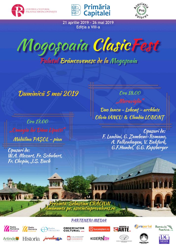 La Palatul Brâncovenesc de la Mogoşoaia, continuă ediţia a VIII-a a Mogoşoaia ClasicFest, eveniment sonor de anvergură organizat de Primăria Municipiului Bucureşti, prin Centrul Cultural Palatele Brâncoveneşti de la Porţile Bucureştiului şi Asociatia Culturală Pro Valores.