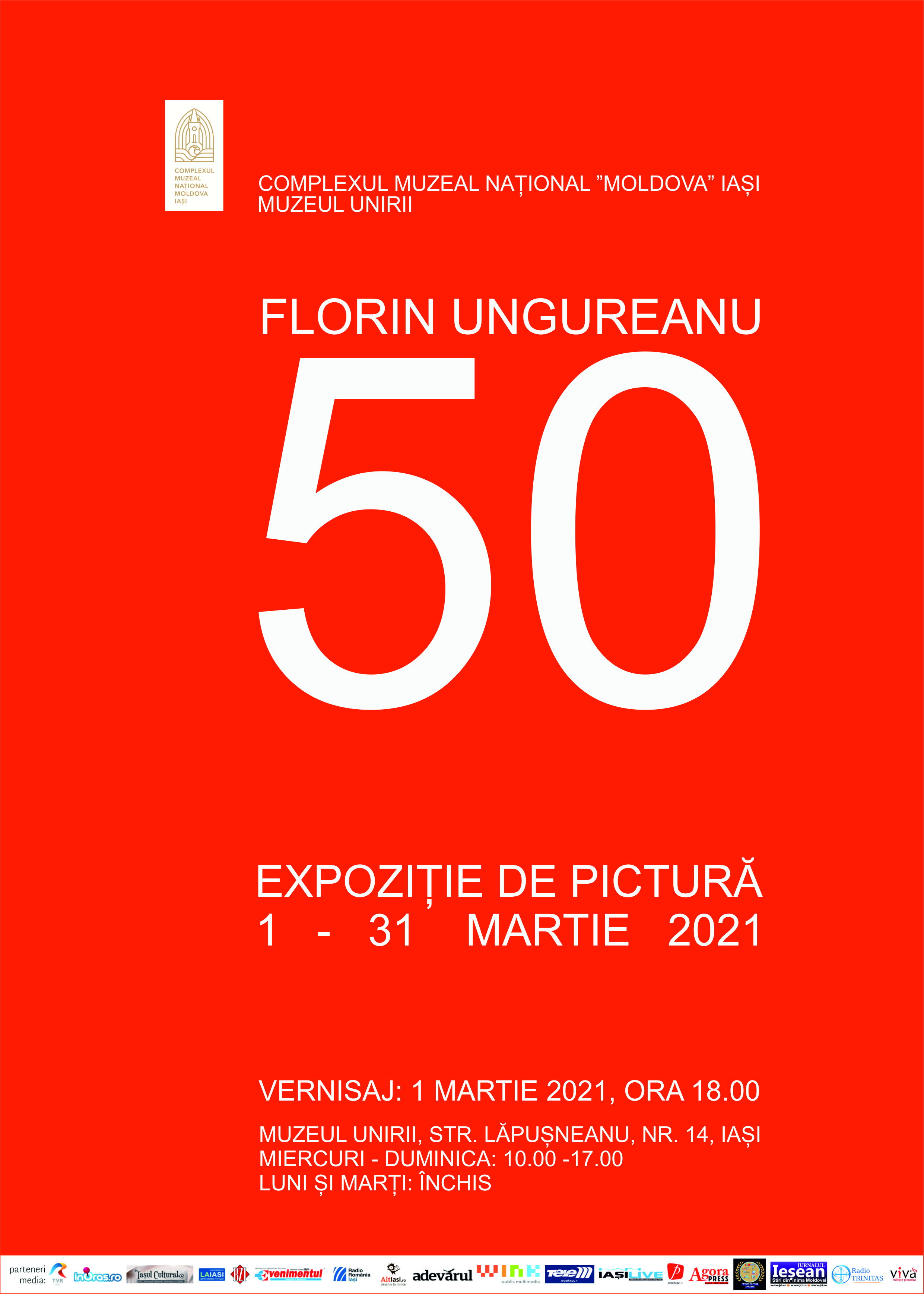 Complexul Muzeal Național „Moldova” Iași, în parteneriat cu Uniunea Artiștilor Plastici din România – Filiala Iași, organizează expoziția „50”, semnată de Florin Ungureanu, reunind pe simeze, la Muzeul Unirii, lucrări din diferite etape de creație ale artistului.