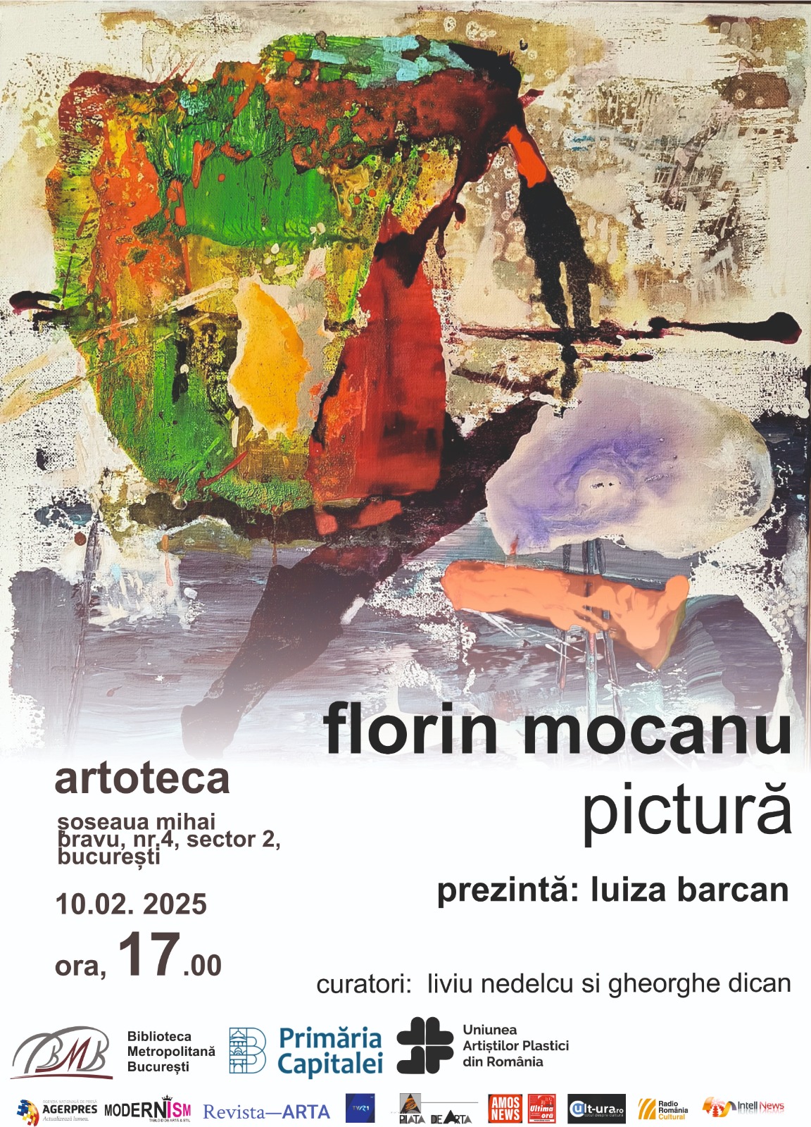 Primăria Municipiului București, prin Biblioteca Metropolitană București, în parteneriat cu Uniunea Artiștilor Plastici din România, vă invită luni, 10 februarie 2025, ora 17:00, la vernisajul expoziției „Florin Mocanu – Pictură”. Evenimentul se va desfășura la Artoteca BMB, șos. Mihai Bravu, nr. 4.