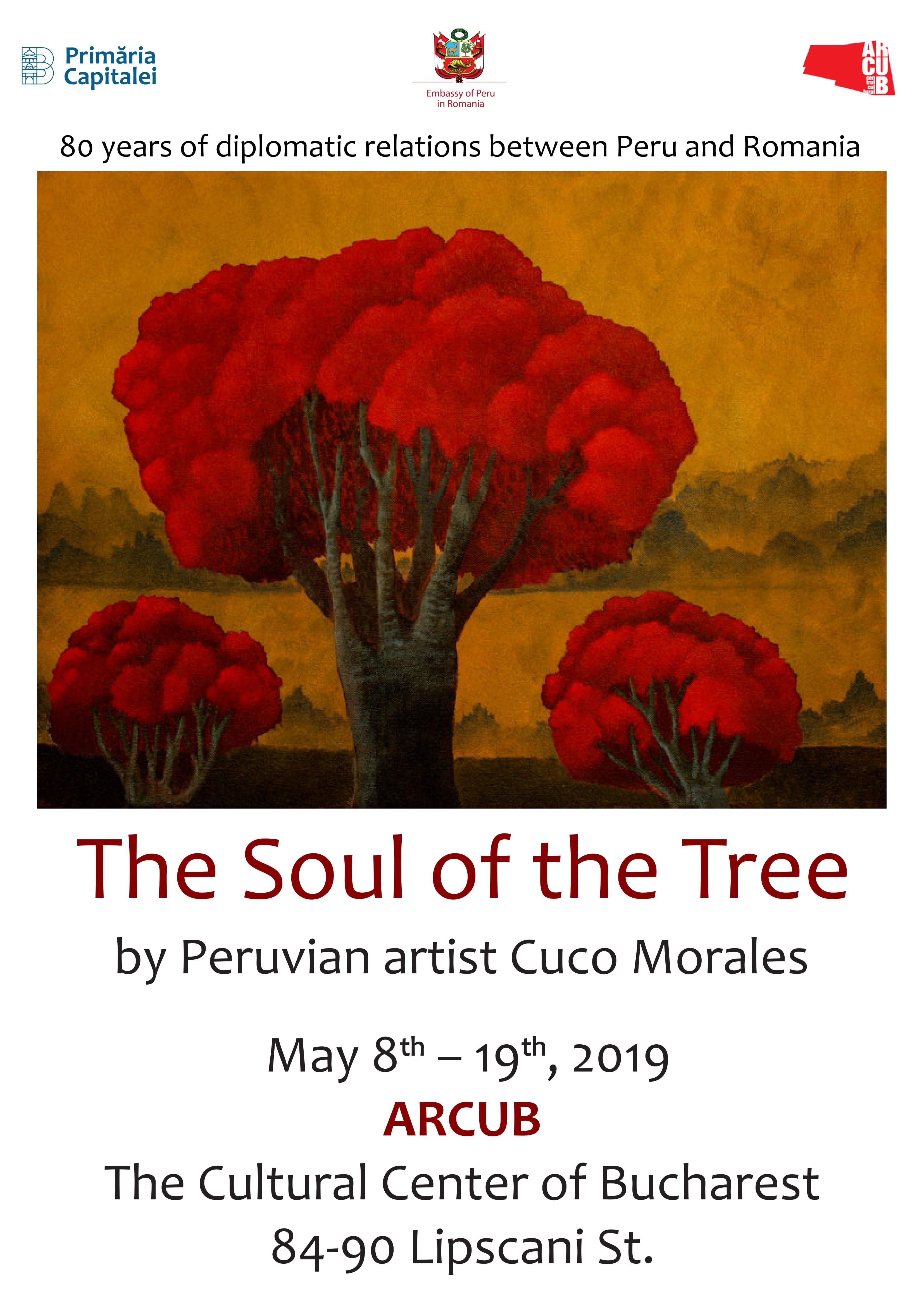 Ambasada Republicii Peru în România, în parteneriat cu Primăria Capitalei, prin ARCUB, are plăcerea să anunţe vernisajul expoziţiei de pictură „El alma del arbol/ Sufletul copacului” a renumitului artist peruan José Antonio „Cuco” Morales Velit. Vernisajul, desfăşurat în prezenţa artistului, va avea loc la ARCUB, în data de 8 mai, începând cu ora 18:30, fiind urmat de un cocktail cu băuturi şi gustări tradiţionale peruane, precum Pisco Sour. Acest eveniment are loc în contextul aniversării celor 80 de ani de relaţii diplomatice dintre Peru şi România.