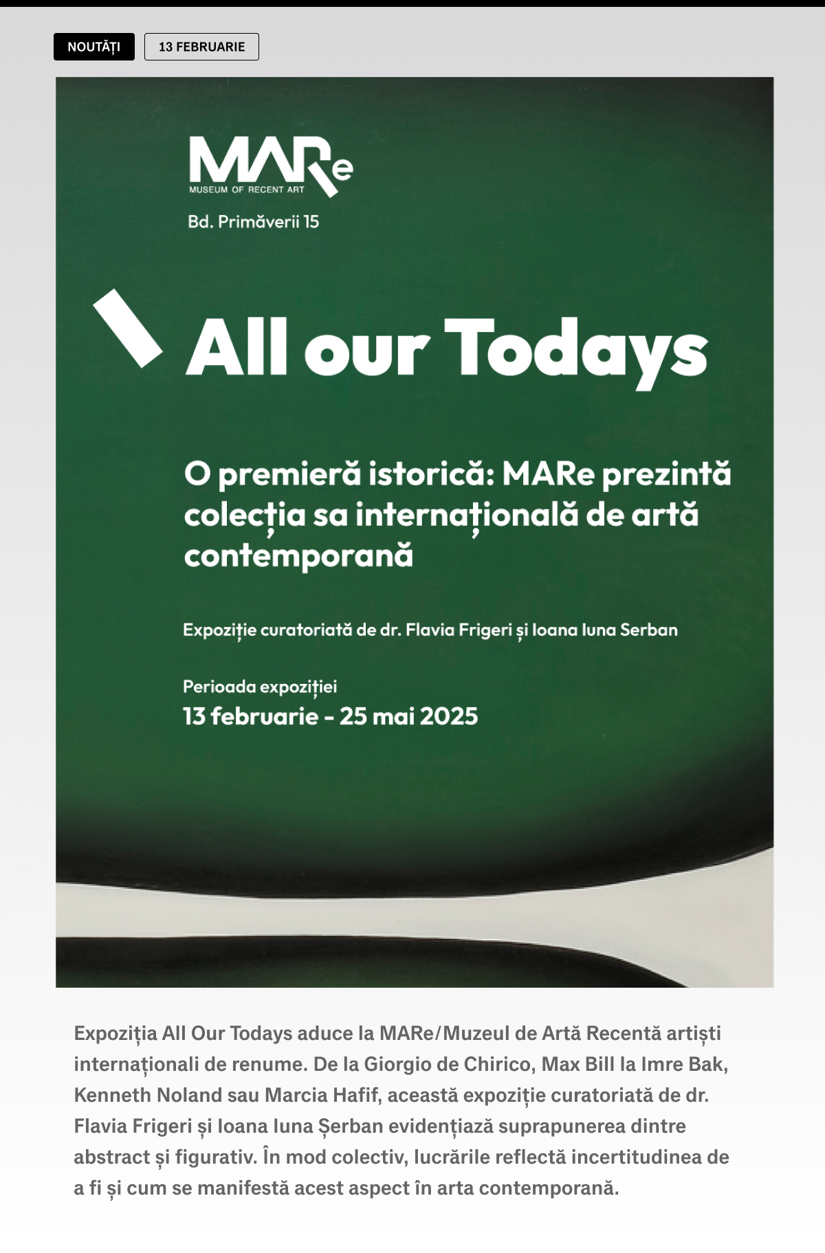 Expoziția „All Our Todays” prezintă o varietate de artiști contemporani internaționali, cu un accent deosebit pe influența lui Giorgio de Chirico și Max Bill. În special în cadrul artiștilor germani, este prezentată o diversitate de abordări stilistice și conceptuale care reflectă tensiunile dintre figurativ și abstract.