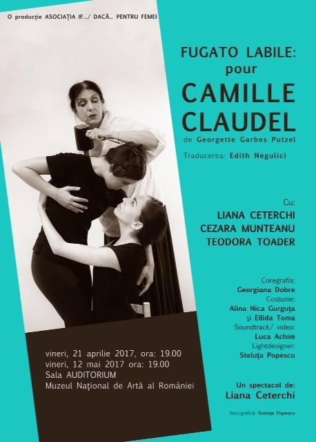 O punere în scenă a piesei lui Georgette Garbès Putzel intitulată “Fugato labile pour Camille Claudel”, interpretată de Asociaţia Femeilor din Teatru IF…/DACĂ …PENTRU FEMEI, va avea loc în Sala Auditorium în două reprezentaţii distincte în ziua de vineri, pe 21 aprilie, orele 19.00, respectiv 12 mai, orele 19.00, 2017.