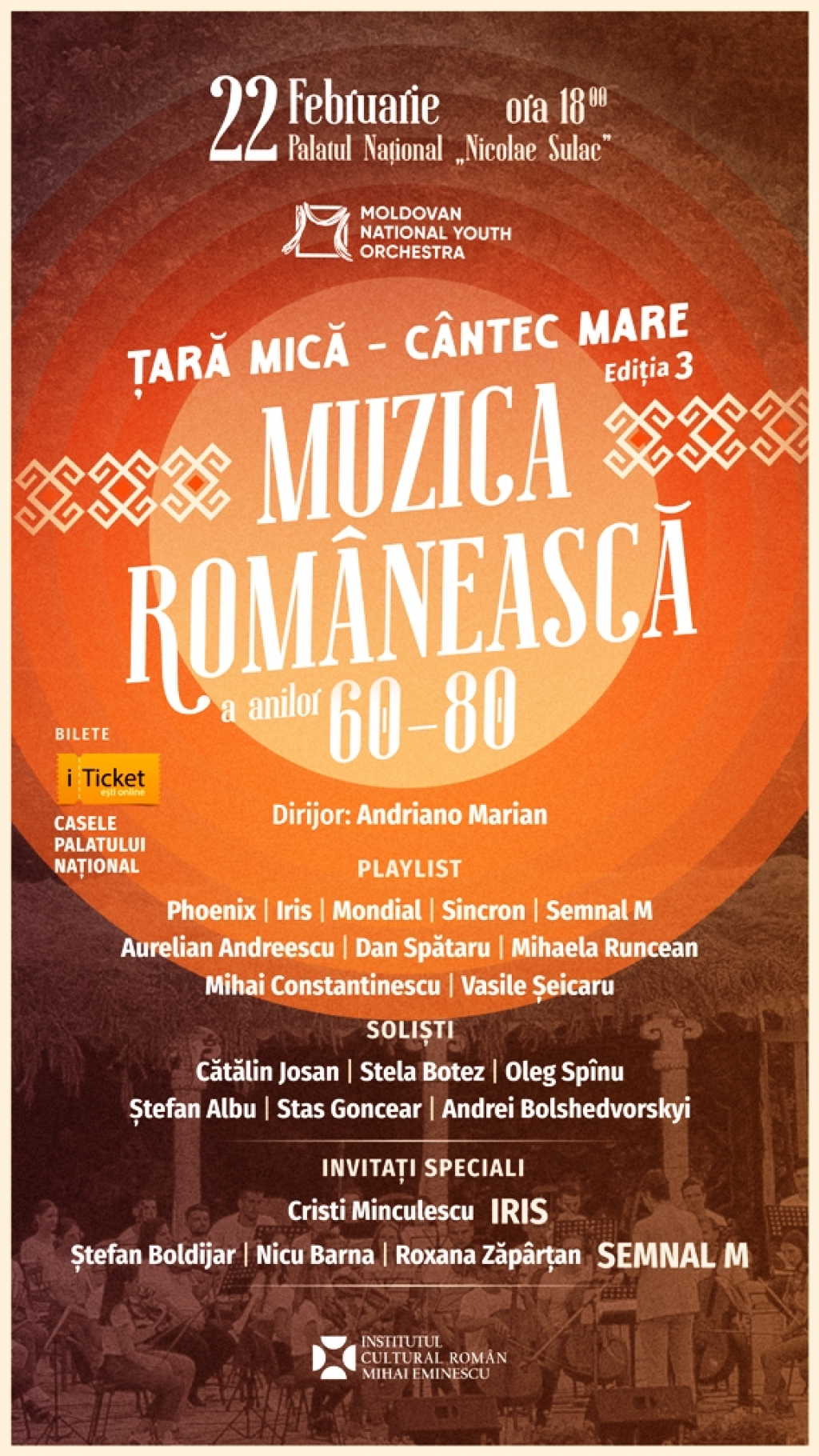 Institutul Cultural Român „Mihai Eminescu” de la Chișinău sprijină participarea muzicienilor români Cristian Minculescu, solistul formației Iris, și Nicu Barna, Roxana Zăpârțan și Ștefan Boldijar, membrii trupei Semnal M, la ediția specială a proiectului simfonic „Țară Mică – Cântec Mare” dedicată muzicii românești din anii ’60-’80.