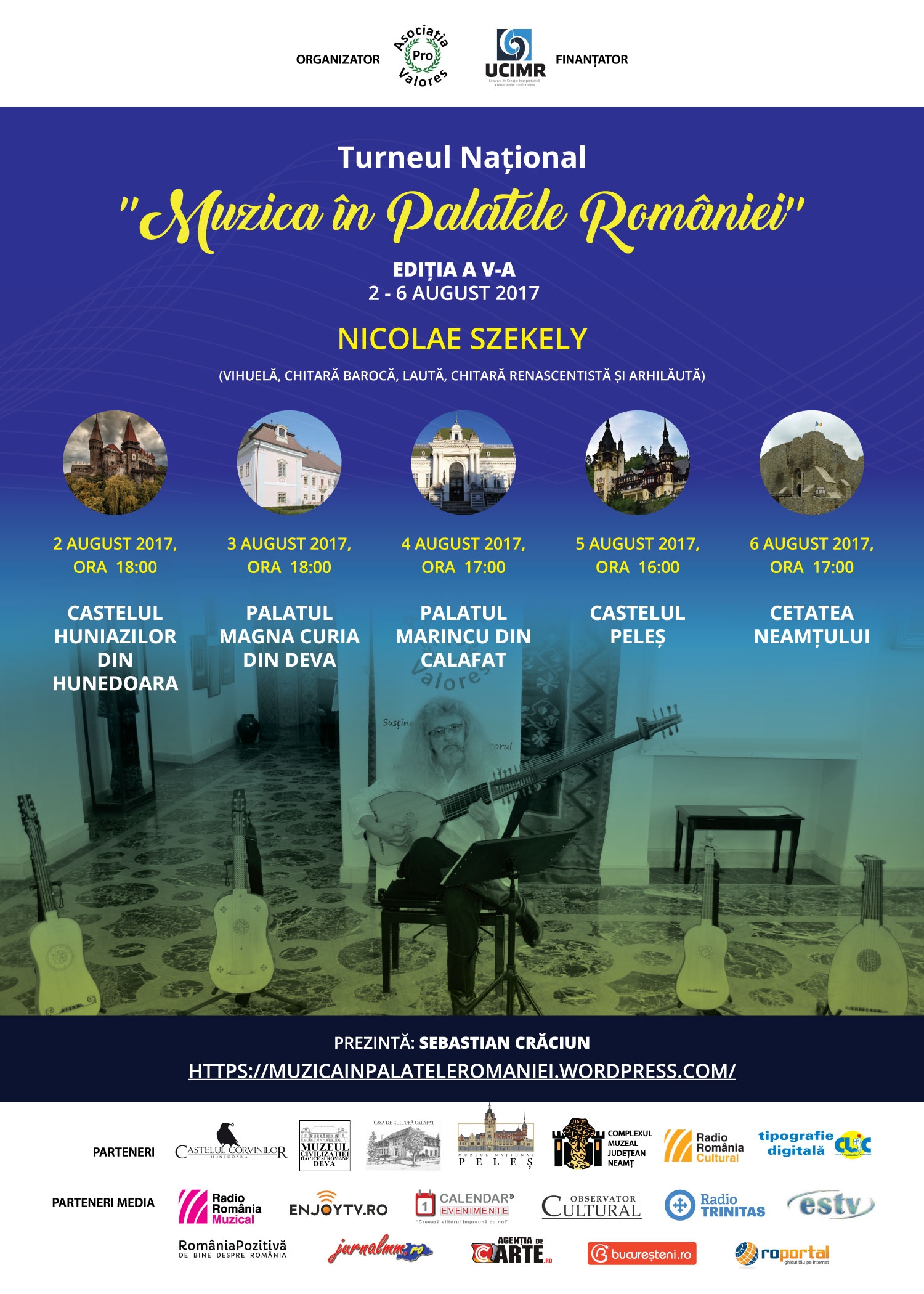 După incredibilul succes al concertului semnal care a avut loc pe 11 iunie la Palatul Brâncovenesc de la Mogoşoaia, protagonistul evenimentului itinerant –menestrelul modern Nicolae Szekely, va concerta la: Castelul Huniazilor din Hunedoara (Miercuri 2 august, ora 18), Palatul Magna Curia din Deva (Joi 3 august, ora 18), Palatul Marincu din Calafat (Vineri 4 august, ora 17), Castelul Peleş de la Sinaia (Sâmbătă 5 august, ora 16) şi Cetatea Neamţului de la Târgu Neamţ (Duminică 6 august, ora 17).