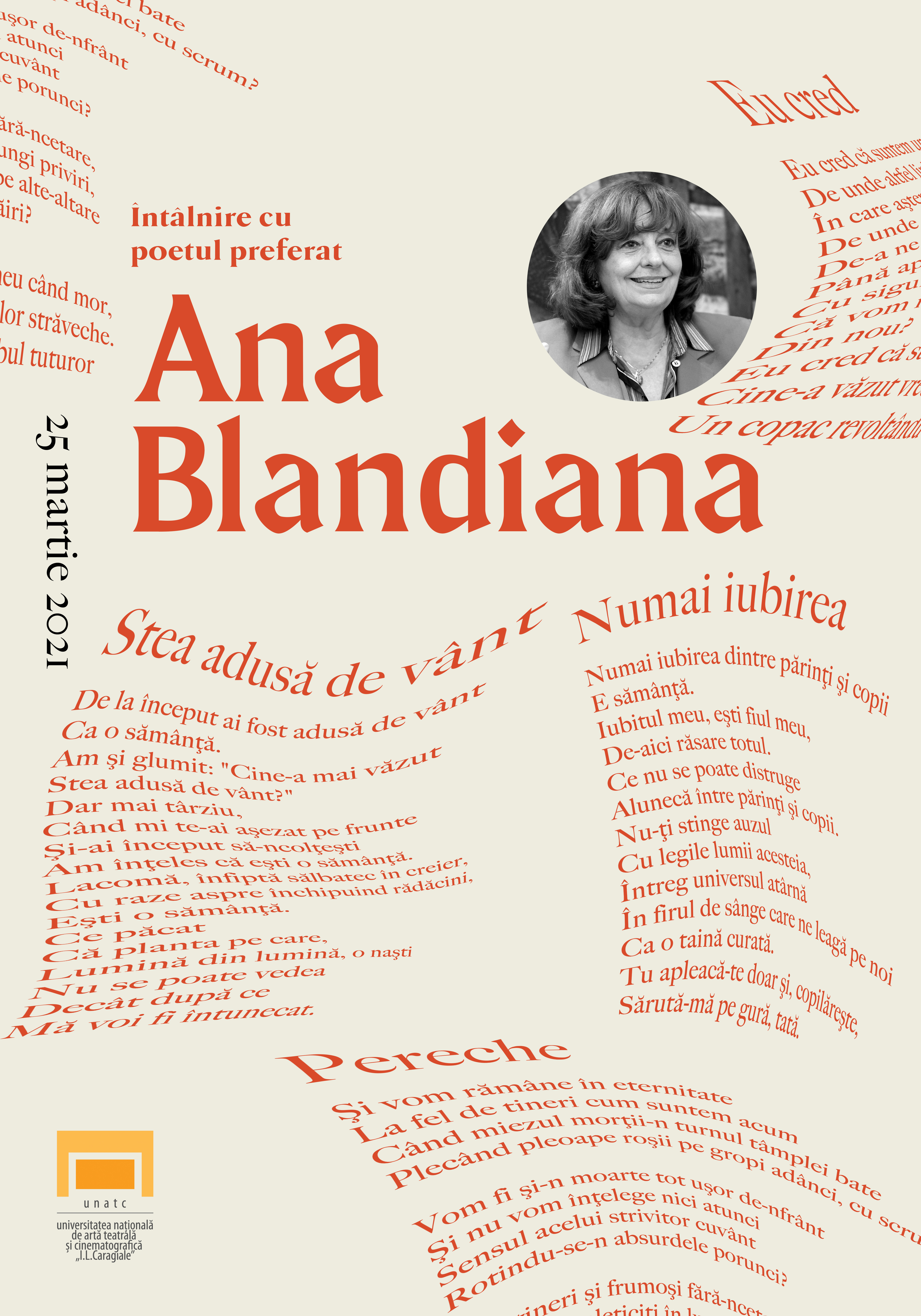 UNATC „I.L. Caragiale” București are onoarea de organiza aniversarea uneia din cele mai importante personalități culturale și, totodată, un reper de atitudine morală și civică: scriitoarea Ana Blandiana.