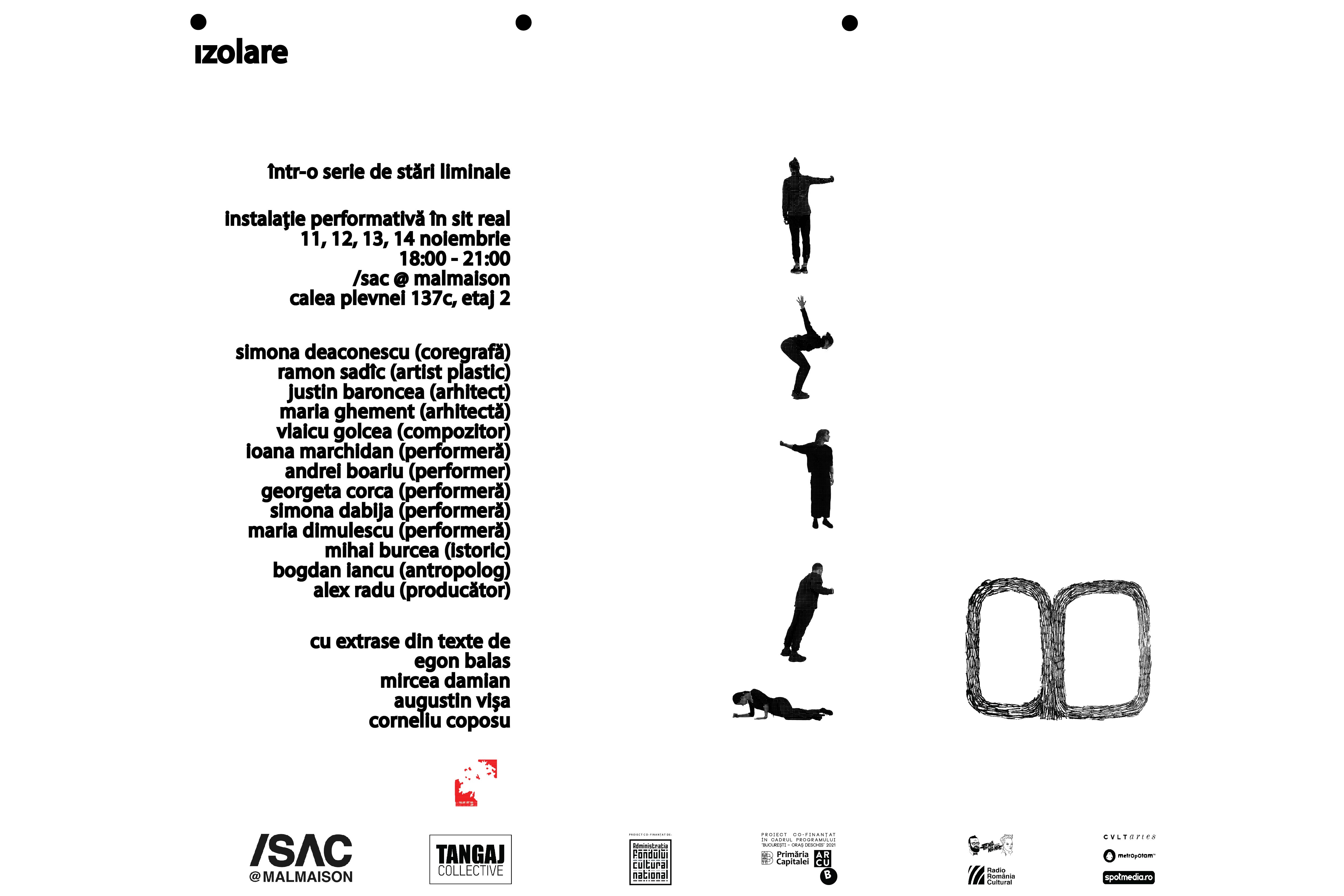 „Izolare într-o serie de stări liminale”, instalație performativă în sit real, care explorează fenomenul izolării conectat cu istoria complexă a clădirii Malmaison, fostă garnizoană militară, tribunal politic și centru de detenție temporară pentru militari și intelectuali, va avea premiera pe 11 noiembrie la /SAC @ MALMAISON la ora 18:00 și va fi urmată de alte trei reprezentații pe 12, 13 și 14 noiembrie în același spațiu.