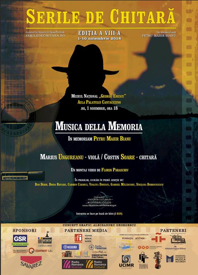 Joi, 1 noiembrie, începe cea de-a opta ediţie a Festivalului Internaţional „Serile de chitară”, ediţie dedicată memoriei lui Petru Maier Bianu, cineast şi scriitor, cel care a iniţiat alături de Costin Soare în 2008, în cadrul Stagiunii „Iosif Sava” a Fundaţiei ACCUMM, prima ediţie a acestui eveniment. Concertul de deschidere, desfăşurat de la ora 18 în Aula Palatul Cantacuzino (Muzeul Naţional „George Enescu”), intitulat „Musica della Memoria”, reuneşte doi interpreţi care l-au cunoscut îndeaproape pe autorul romanului „Inventarul iernilor”, violistul Marius Ungureanu şi chitaristul Costin Soare:aceştia vor prezenta şase lucrări în primă audiţie absolută scrise de câţiva dintre cei mai importanţi compozitori români, însoţite de un montaj video inedit.
