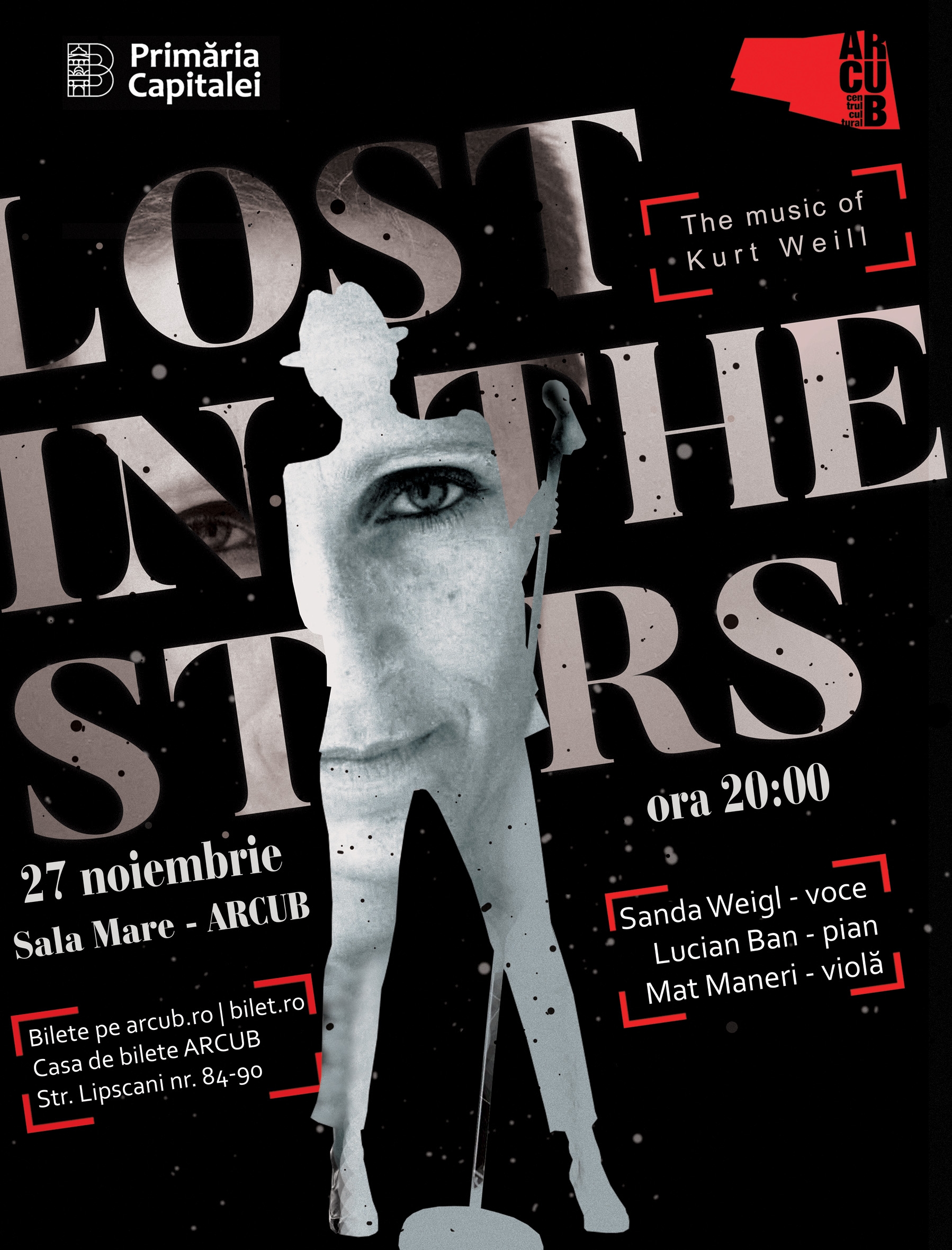 Sanda Weigl încheie turneul său „Lost in The Stars – The music of Kurt Weill” din România cu un concert la ARCUB. După ce a fost prezentat la Barbes Brooklyn, în New York, la BKA-Theater şi Berliner Ensemble din Berlin şi în diferite oraşe din România, proiectul Lost in the Stars aduce marţi, 27 noiembrie, de la ora 20.00, la Sala Mare ARCUB, muzica lui Kurt Weill într-o reinterpretare unică alături de pianistul de jazz Lucian Ban şi violistul Mat Maneri. Evenimentul este organizat de Primăria Capitalei prin ARCUB.