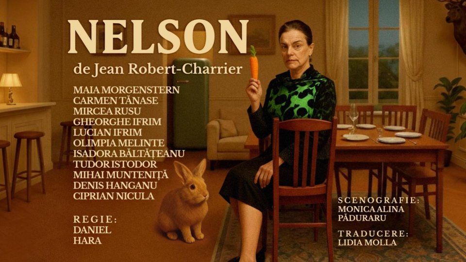 „Nelson” de Jean Robert‑Charrier este o comedie de situație care explorează cu umor şi ironie contrastele sociale şi familiale. Protagonista, Jacqueline, o avocată de succes mânată de ambiţie, avere şi aparenţe, este pusă în situaţia de a-şi ascunde adevărata fire. Atunci când fiica ei, Christine, îşi doreşte să plece într‑o misiune umanitară, Jacqueline acceptă să găzduiască o familie militantă ecologistă. Pe durata unui dineu, ea trebuie să îşi asume temporar un rol de vegană convinsă şi protectoare a animalelor pentru a părea pe „linie” cu invitaţii, iar inima sa va fi sensibilizată de un iepure pitic numit Nelson.