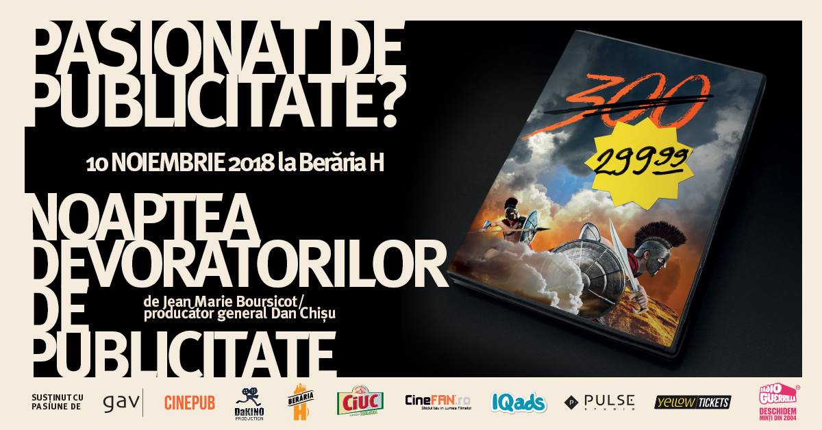 Eşti pasionat de publicitate? Vino pe 10 noiembrie la Berăria H pentru o nouă ediţie a Nopţii Devoratorilor de Publicitate. Începem cu un show de stand-up comedy, apoi continuăm cu proiecţia spoturilor publicitare, prezentate în premieră publicului din România.