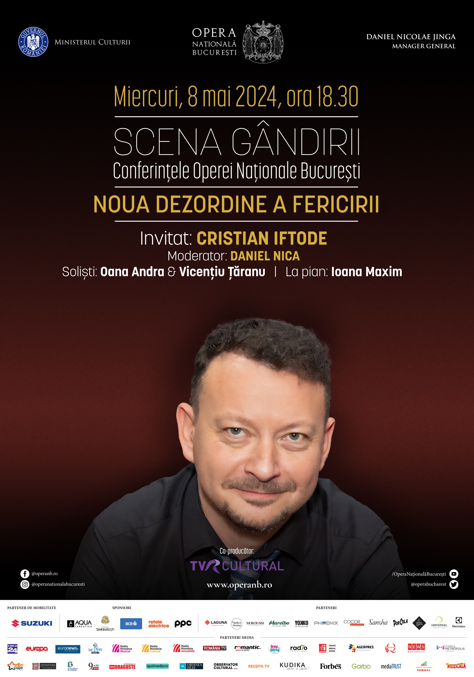 Pe 8 mai 2024, începând cu orele 18.30, Opera Națională București va găzdui o nouă ediție din Scena Gândirii – Conferințele Operei Naționale București. Evenimentul, desfășurat sub titlul „Noua dezordine a fericirii” îl va avea ca invitat pe Cristian Iftode, profesor la Facultatea de Filosofie a Universității din București.