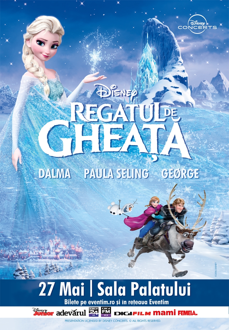 Pe 27 mai, Sala Palatului se va transforma în „Regatul de Gheaţă”. Filmul va rula integral, iar toată muzica va fi cântată live de către orchestră şi cor. Pentru a doua oară într-un eveniment Disney în Concert, Paula Seling, pentru vocea Anei, şi Dalma, pentru vocea Elsei, vor încânta publicul cu “Hai afară la zăpadă”, “S-a întâmplat”, “După atâta amar de vreme” sau “Asta e dragostea”. După o frumoasă şi reuşită colaborare în trecut, cele două soliste, îndrăgostite de muzica Disney, vor da glas surorilor mult îndrăgite. Lor li se alătura George Papagheorghe, pentru melodiile cântate de Hans, Kristoff şi Olaf. Versatilitatea şi vocea cu totul deosebită îi vor permite artistului GEØRGE să interpreteze în aceeaşi seară trei personaje diferite.