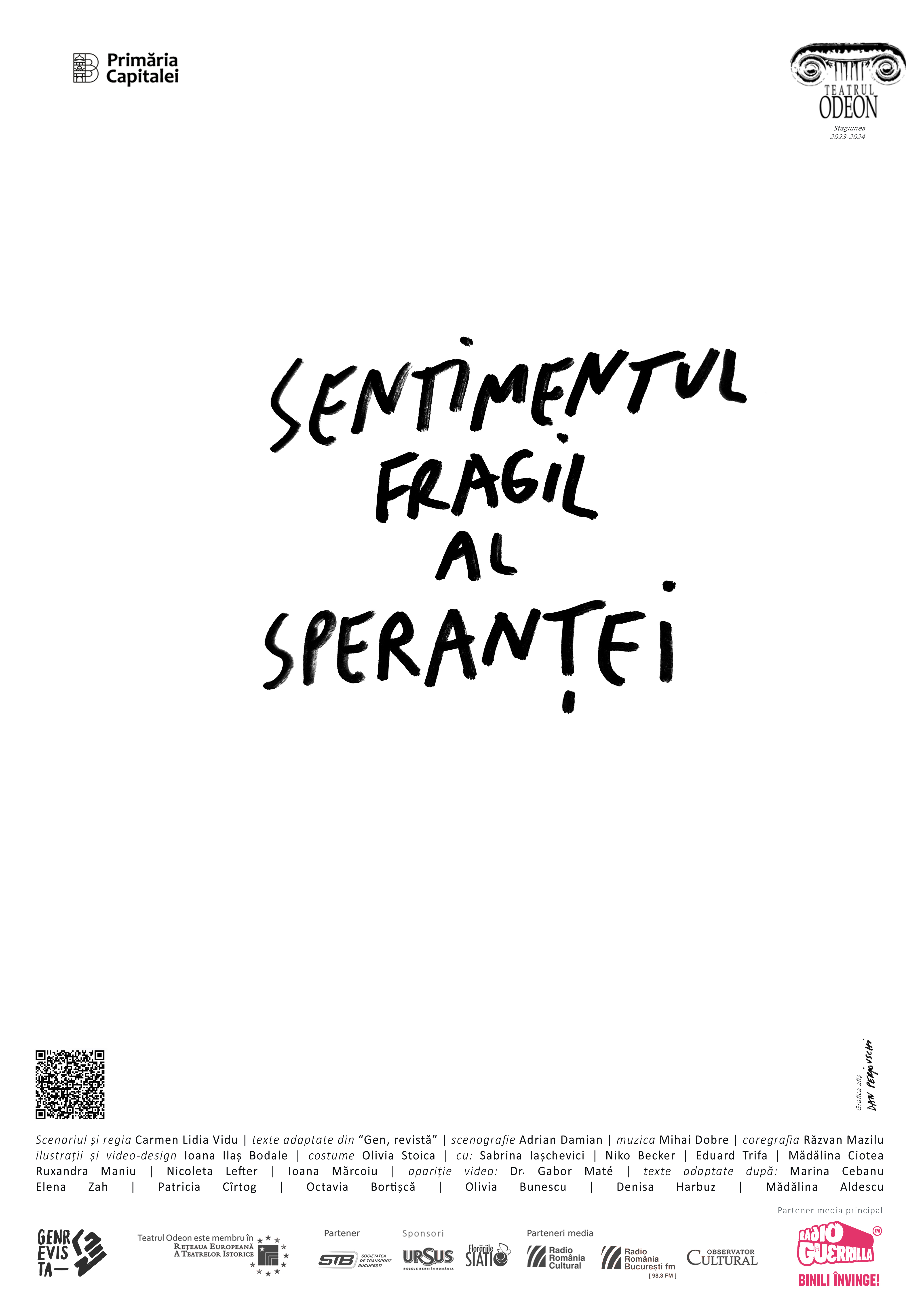 Teatrul Odeon are plăcerea să anunțe premiera spectacolului Sentimentul fragil al speranței, după texte adaptate din Gen, revistă. Scenariul și regia: Carmen Lidia Vidu. Scenografia: Adrian Damian. Muzica: Mihai Dobre. Coregrafia: Răzvan Mazilu. Ilustrații și video-design: Ioana Ilaș Bodale. Costume: Olivia Stoica. Cu: Sabrina Iașchevici, Niko Becker, Eduard Trifa, Mădălina Ciotea, Ruxandra Maniu, Nicoleta Lefter, Ioana Mărcoiu. Apariție video: Dr. Gabor Maté. Texte adaptate după: Marina Cebanu, Elena Zah, Patricia Cîrtog, Octavia Bortișcă, Olivia Bunescu, Denisa Harbuz, Mădălina Aldescu. Grafică afiș: Dan Perjovschi.