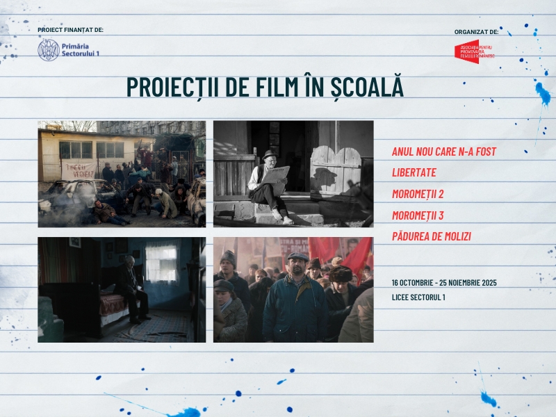 Asociația pentru Promovarea Filmului Românesc (APFR) dă startul, pe 20 octombrie, proiectului „Proiecții de film în școală”, o inițiativă de educație culturală și vizuală destinată elevilor din Sectorul 1 și finanțată de Primăria Sectorului 1 a Municipiului București. Timp de o lună, liceenii și profesorii vor transforma sălile de clasă în spații de cinema, unde filme românești care tratează subiecte inspirate din istoria recentă devin puncte de plecare pentru dialog, reflecție și învățare prin cultură.