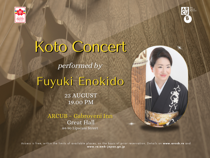Ambasada Japoniei în România invită publicul bucureștean la un recital extraordinar de koto, susținut de renumita artistă japoneză, Fuyuki Enokido. Evenimentul va avea loc pe data de 23 august, la ARCUB – Hanul Gabroveni, Sala Mare, ora 19.00, și promite să ofere o seară de neuitat, plină de muzică tradițională japoneză. Evenimentul se desfășoară cu sprijinul ARCUB – Centrul Cultural al Municipiului București.