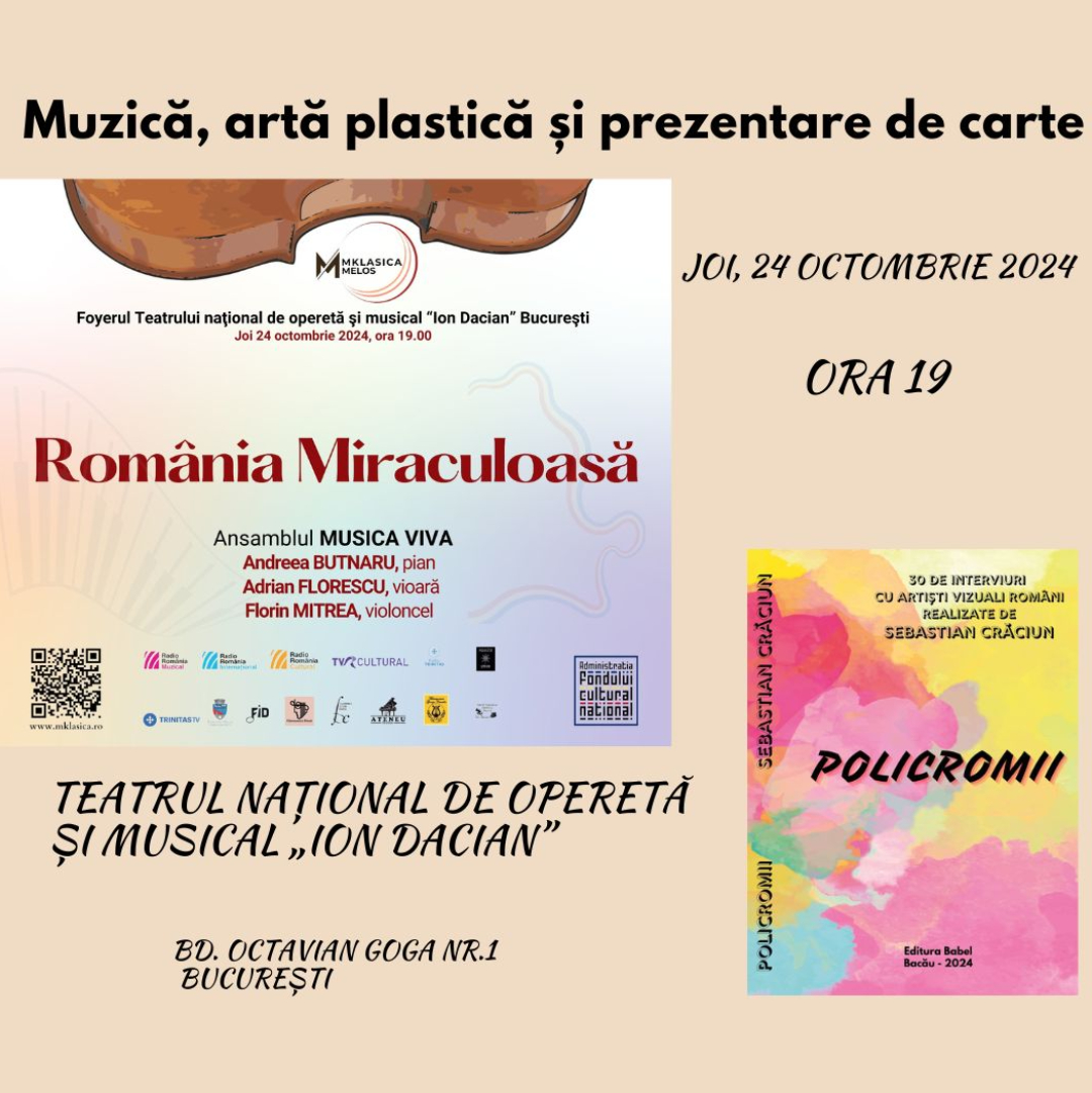 Puteți descoperi România miraculoasă într-un mod muzical, inedit și interactiv, înfățișată de Ansamblul Musica Viva, în seara de joi, 24 octombrie 2024, începând cu ora 19.00, la Teatrul Naţional de Operetă şi Musical „Ion Dacian” din Bucureşti.