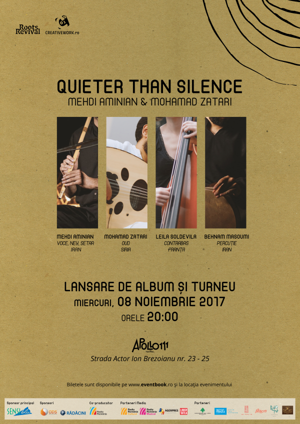 Teatrul Apollo111 anunță concertul de lansare al celui de-al treilea album al formației Roots Revival – Quieter than Silence, care precede un turneu național. “Quieter than Silence”/ “Mai tăcut decât liniștea” prezintă compoziții noi, de inspirație persană și siriană (alepiană), interpretate sinergic la instrumente orientale (ney, setar, oud, kamancheh, percuție iraniană) și contrabass, fiind o formă de exprimare a compasiunii artiștilor pentru sirienii aflați în suferință, mâhniți și pribegi. Concertul va avea loc miercuri, 8 noiembrie, de la ora 20:00.